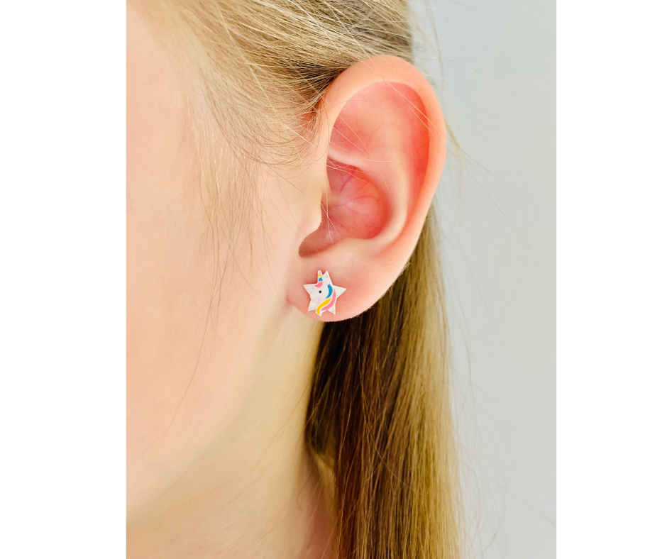 Kolczyki dziecięce zachwycają kolorową emalią, która nadaje im radosny i wyjątkowy charakter. Motyw jednorożca w gwiazdce to bajkowy wzór, który sprawi, że każda dziewczynka poczuje się wyjątkowo. Dzięki praktycznemu zapięciu sztyft kolczyki są wygodne w noszeniu i odpowiednio dopasowane do uszu dziecka, co gwarantuje komfort i bezpieczeństwo nawet podczas codziennych aktywności.