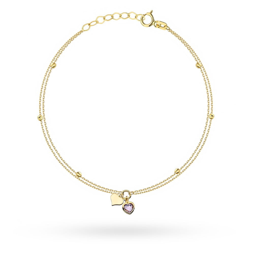 Bransoletka złota 585 podwójna z wiszącymi zawieszkami, sercem, ametyst i diamentowanymi kulkami