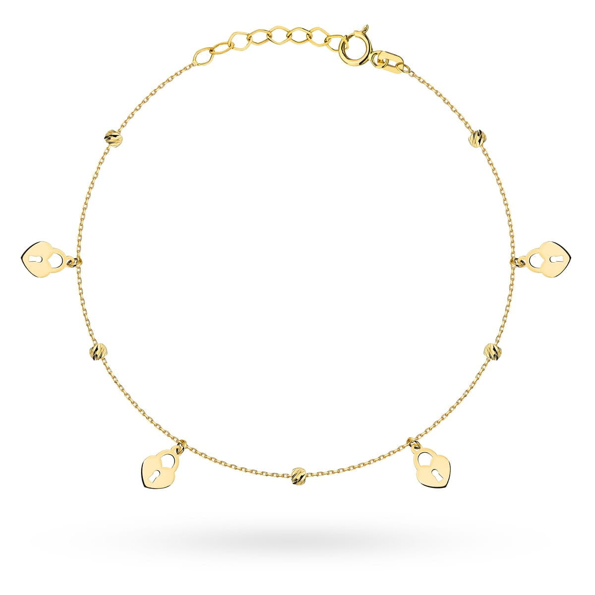 Rodzaj Pełny Długość [cm] 17 + 2 (regulacja długości) Kamień Bez kamienia Wzór Kłódka Materiał Złoto Próba złota 585 Kolor złota Żółty Szerokość kłódki [mm] 5 Wysokość kłódki [mm] 6,5 Średnica kulek diamentowanych [mm] 2 Delikatna złota bransoletka próby 585. Zajmujemy się  sprzedażą biżuterii ze złota. Sprzedajemy towary pochodzące od krajowych i zagranicznych producentów. Wszystkie produkty pochodzą z legalnego źródła. Wystawiamy faktury VAT.