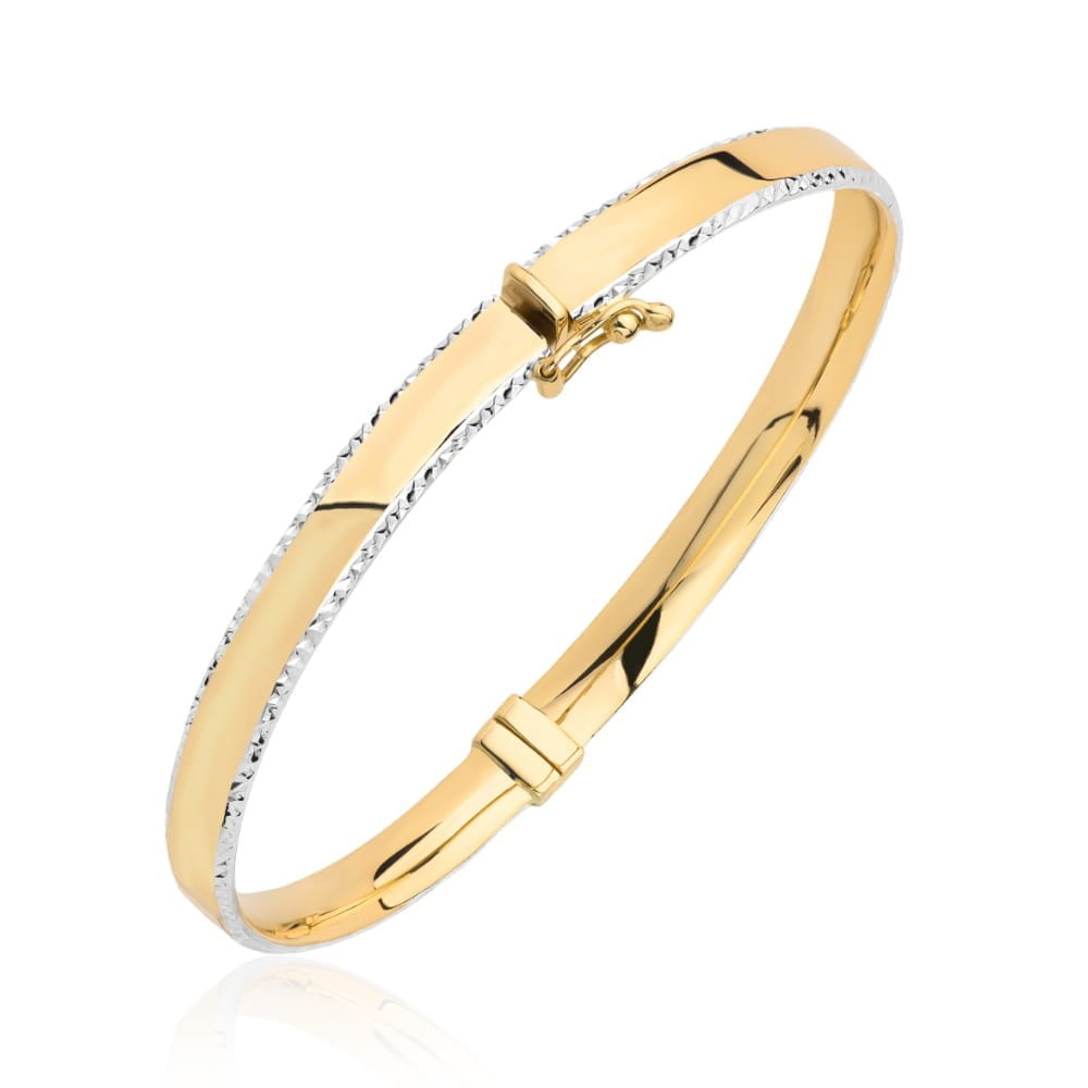 Rodzaj Pełny Kamień Bez kamienia Wzór Owal Materiał Złoto Próba złota 585 Kolor złota Żółty / Białe Szerokość wewnętrzna [mm] ok. 62 x 56 Szerokość boku [mm] ok. 5 Elegancka, wieczorowa bransoletka owalna sztywna ozdobiona białym złotem próby 585. Zajmujemy się  sprzedażą biżuterii ze złota. Sprzedajemy towary pochodzące od krajowych i zagranicznych producentów. Wszystkie produkty pochodzą z legalnego źródła. Wystawiamy faktury VAT.