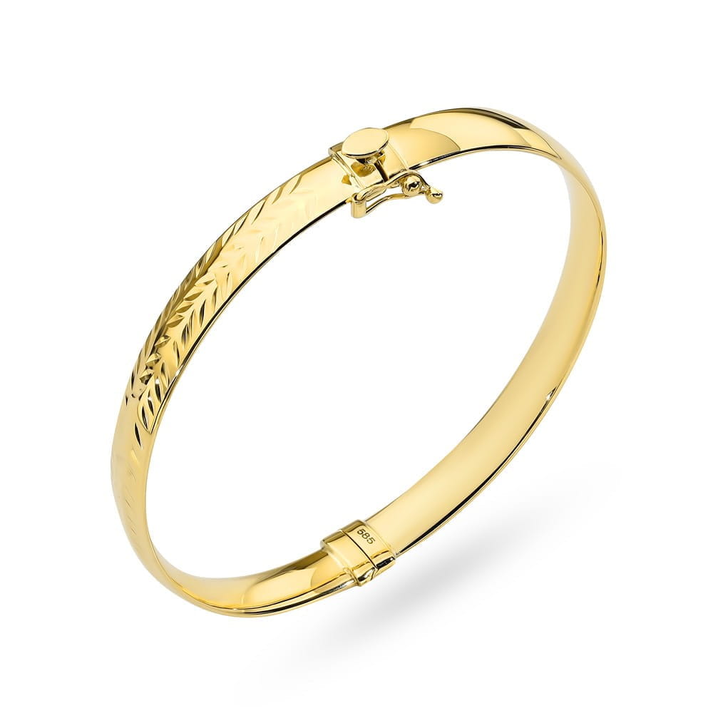 Rodzaj Pełny Kamień Bez kamienia Wzór Owal Materiał Złoto Próba złota 585 Kolor złota Żółty Szerokość wewnętrzna [mm] ok. 60 x 55 Szerokość boku [mm] ok. 6 Elegancka, wieczorowa bransoletka sztywna ozdobiona diamentowaniem próby 585. Zajmujemy się  sprzedażą biżuterii ze złota. Sprzedajemy towary pochodzące od krajowych i zagranicznych producentów. Wszystkie produkty pochodzą z legalnego źródła. Wystawiamy faktury VAT.