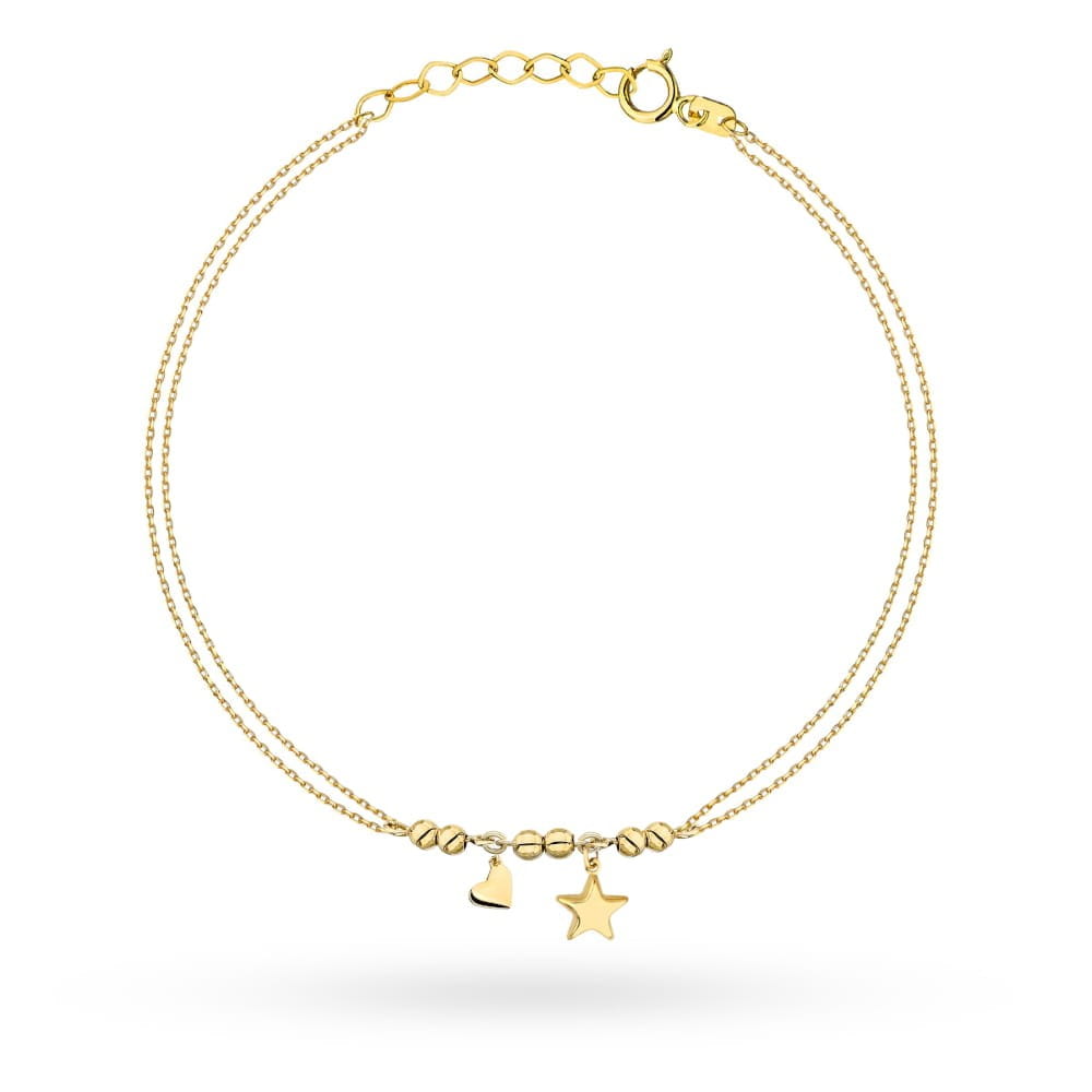 Bransoletka złota z gładkimi kulkami, sercem i gwiazdką na podwójnym łańcuszku