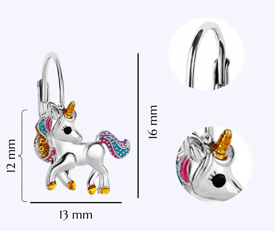 Srebrne kolczyki jednorożce dla dziewczynki, wykonane zostały ze srebra próby 925 z dodatkiem złocenia 14 K. Kolczyki posiadają zapięcie typu angielskiego, które jest idealnie dopasowane do dziecięcego uszka. Kolczyki w kształcie jednorożców to urocza i kreatywna biżuteria, która cieszy się dużą popularnością wśród dzieci, lubiących magię, fantazję i mitologiczne stworzenia. Jednorożce uważane są za symbol szczęścia, czystości i siły. W ofercie mamy również zawieszkę, która w połączeniu z kolczykami stworzy wyjątkowy i niepowtarzalny zestaw. Kolczyki nie zawierają niklu, przez co nie uczulają i nie powodują reakcji alergicznej.