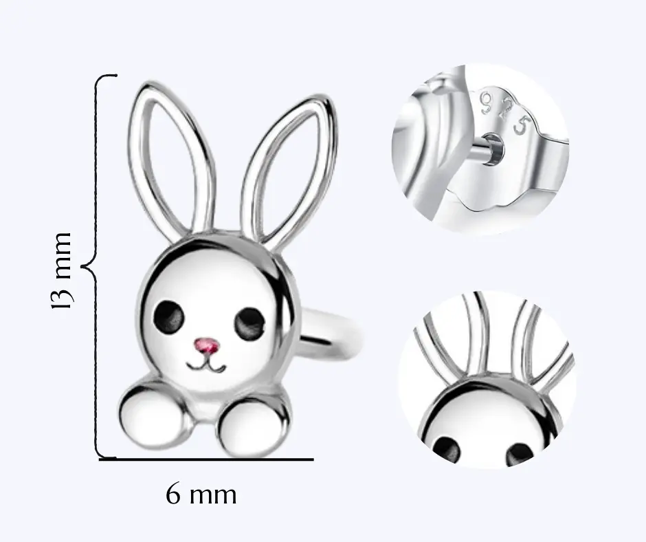 Urocze kolczyki srebrne króliczki rodowane, idealne dla dzieci. Kolczyki wykonane z najwyższej jakości srebra rodowanego próby 925, co zapewnia trwałość i elegancję. Doskonałe dla dziewczynki, która kocha delikatną i zabawną biżuterię. Kolczyki króliczki to świetny wybór na prezent dla dzieci na każdą okazję. Bezpieczne i wygodne w noszeniu, te kolczyki dodadzą uroku każdej małej damie.