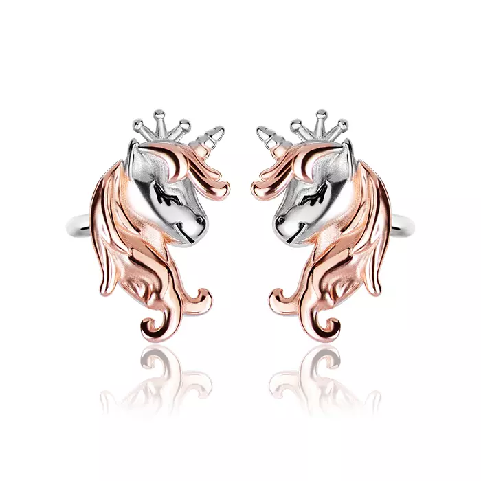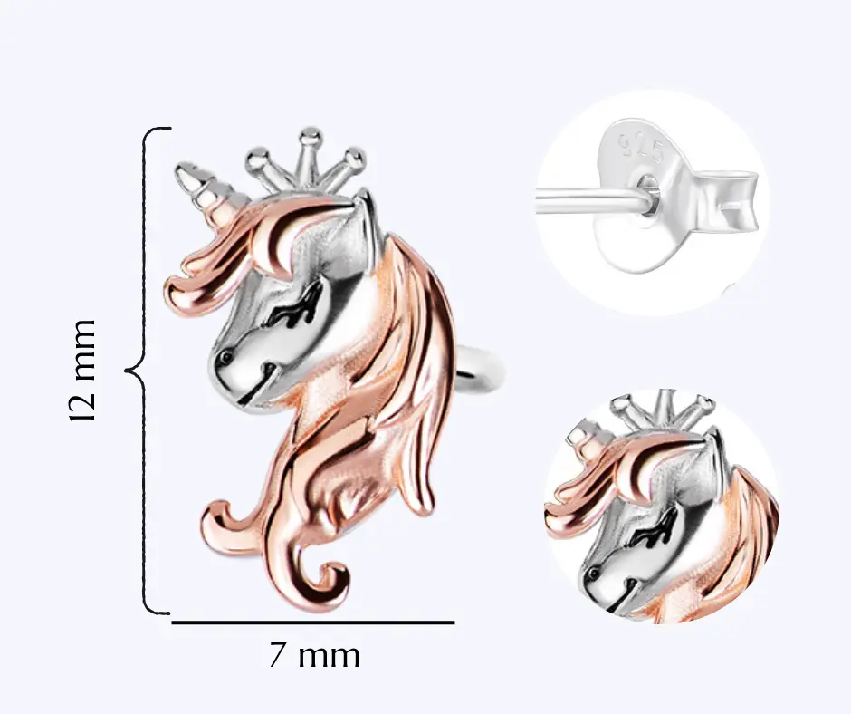 Kolczyki srebrne jednorożce wykonane ze srebra próby 925, to wyjątkowy element biżuterii, który łączy uroczy, bajkowy design z nowoczesnym stylem. Każdy kolczyk jest subtelnie ozdobiony delikatnym, różowym złotem, co nadaje mu elegancji i wyjątkowego blasku. Zapięcie typu sztyft zapewnia wygodę noszenia oraz bezpieczeństwo, idealne dla codziennych stylizacji małych i dużych miłośniczek jednorożców. Te urocze kolczyki są doskonałym wyborem na prezent, dodając dziewczęcego wdzięku i magicznego charakteru każdej stylizacji. Sprawdź naszą ofertę i wybierz coś wyjątkowego!