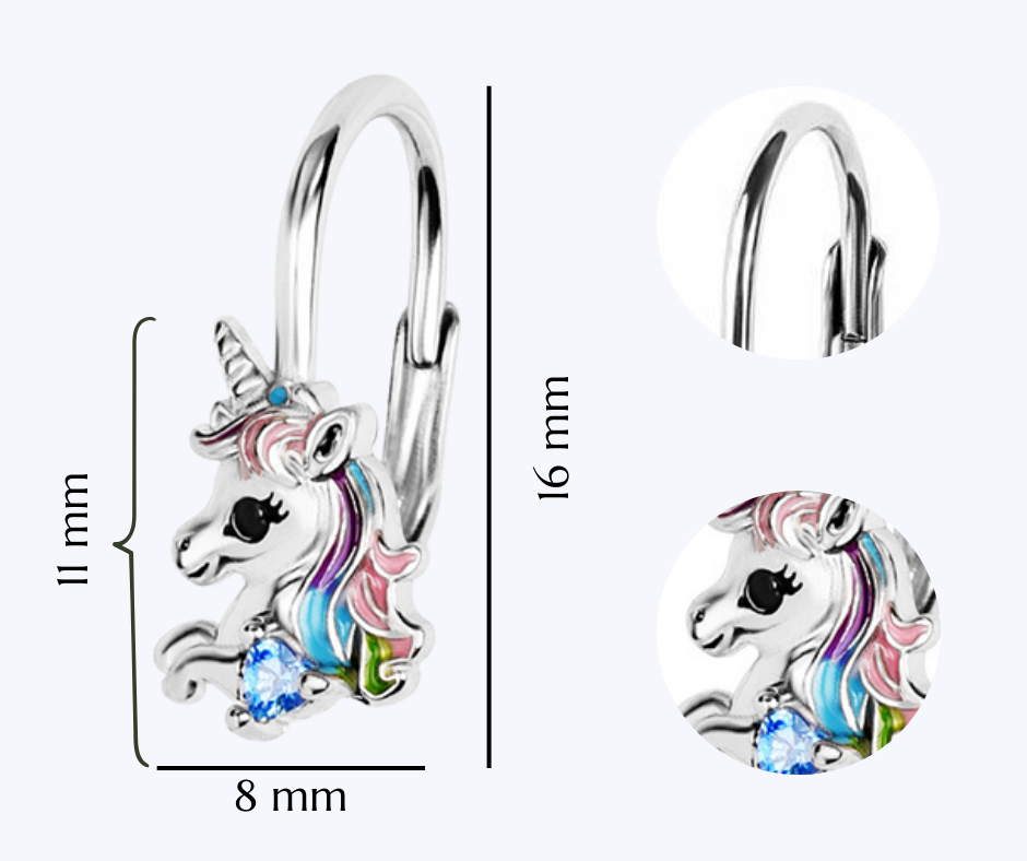 Kolczyki zostały wykonane ze srebra i poddane rodowaniu, co sprawia, że pięknie się błyszczą, są bardziej odporne na ciemnienie oraz przyjazne dla wrażliwej skóry dziecka. Zapięcie angielskie zapewnia wygodę i bezpieczeństwo noszenia, co jest szczególnie istotne w przypadku biżuterii dziecięcej. Urocza, błękitna cyrkonia subtelnie odbija światło, dodając kolczykom bajkowego charakteru, nie przytłaczając przy tym delikatnej formy jednorożca.