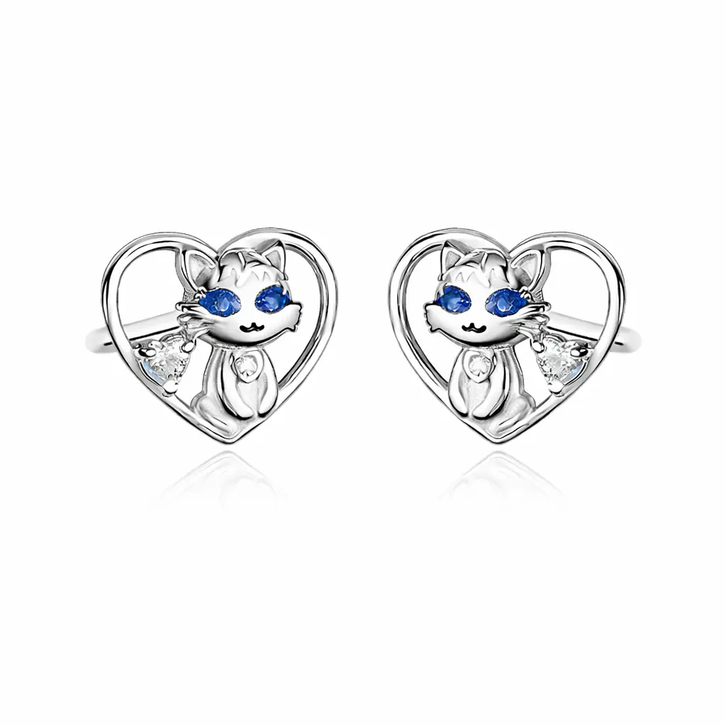 Kolczyki srebrne dla dziewczynki Kotki w sercu rodowane sztyft 925
