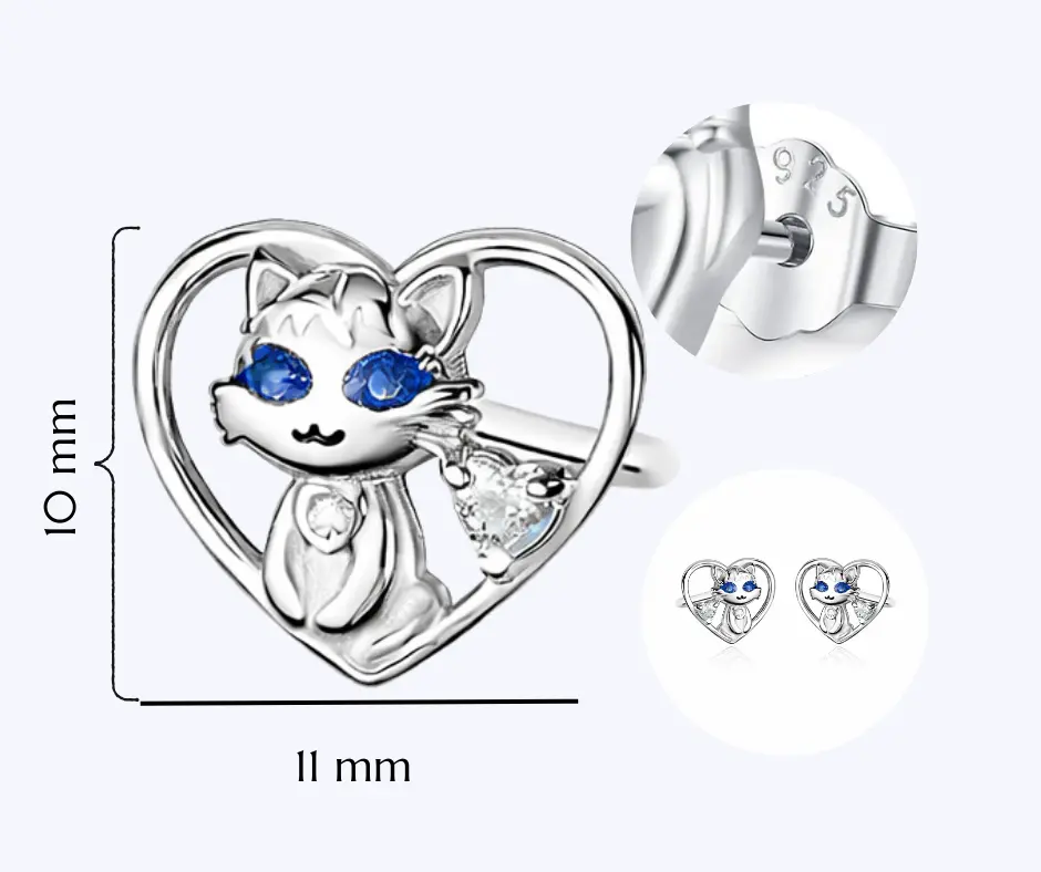 Kolczyki Srebrne Kotki w Sercu dla dziewczynki, Rodowane, Wkrętki