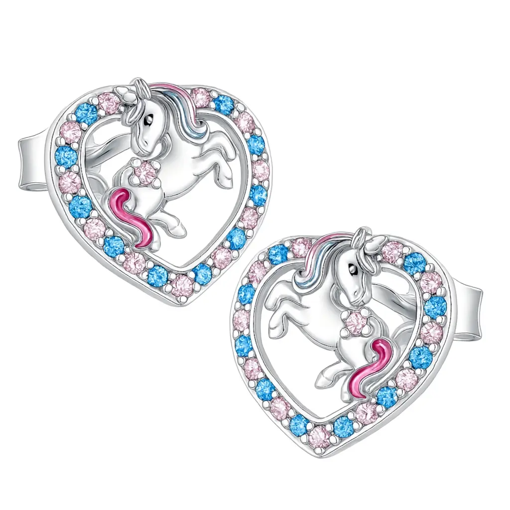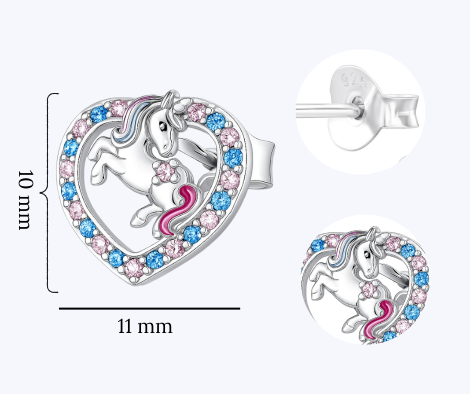 Kolczyki srebrne dla dziewczynki jednorożce w sercu z cyrkoniami sztyft