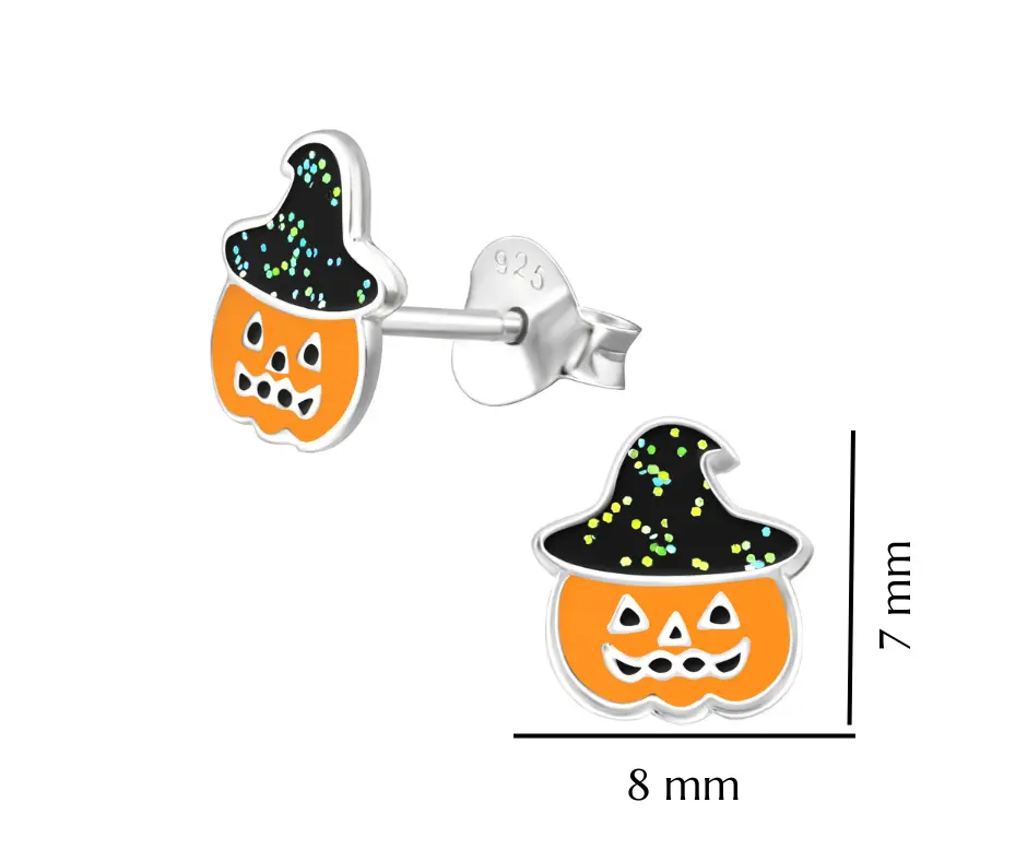 Kolczyki srebrne dynie w kapeluszu z brokatem Halloween sztyft