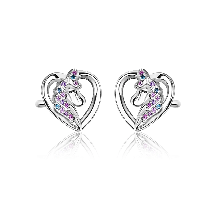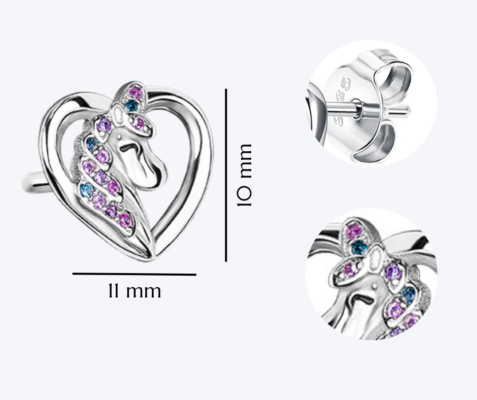 Kolczyki srebrne jednorożce serce dla dziewczynki z cyrkoniami sztyft 925