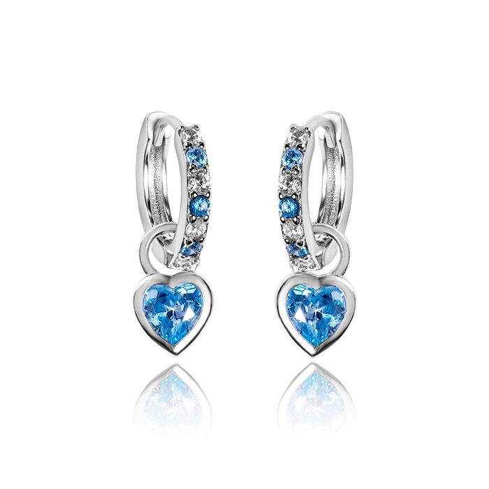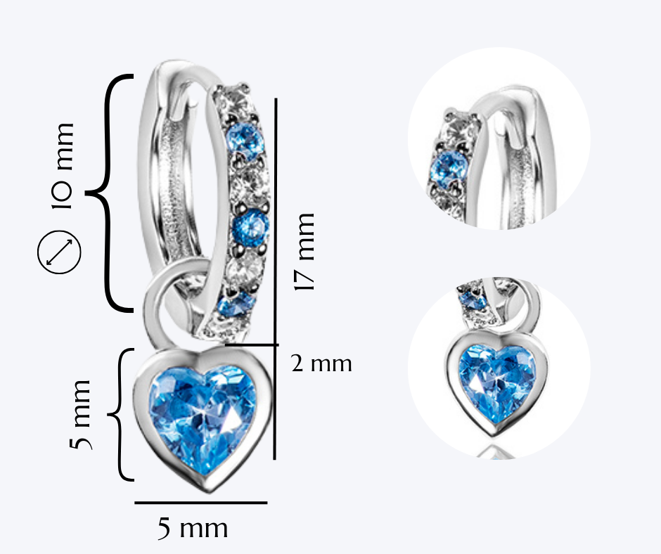 Centralnym elementem kolczyków jest zawieszka w kształcie błękitnego serduszka, wysadzana pięknie połyskującymi cyrkoniami w odcieniu nieba. Co istotne, zawieszkę można zdjąć, co sprawia, że kolczyki zyskują dwa różne oblicza: klasyczne kółeczka na co dzień oraz wersję z serduszkiem na wyjątkowe chwile. Połączenie rodowanych białych i błękitnych cyrkonii tworzy efekt pełen delikatności i wdzięku.