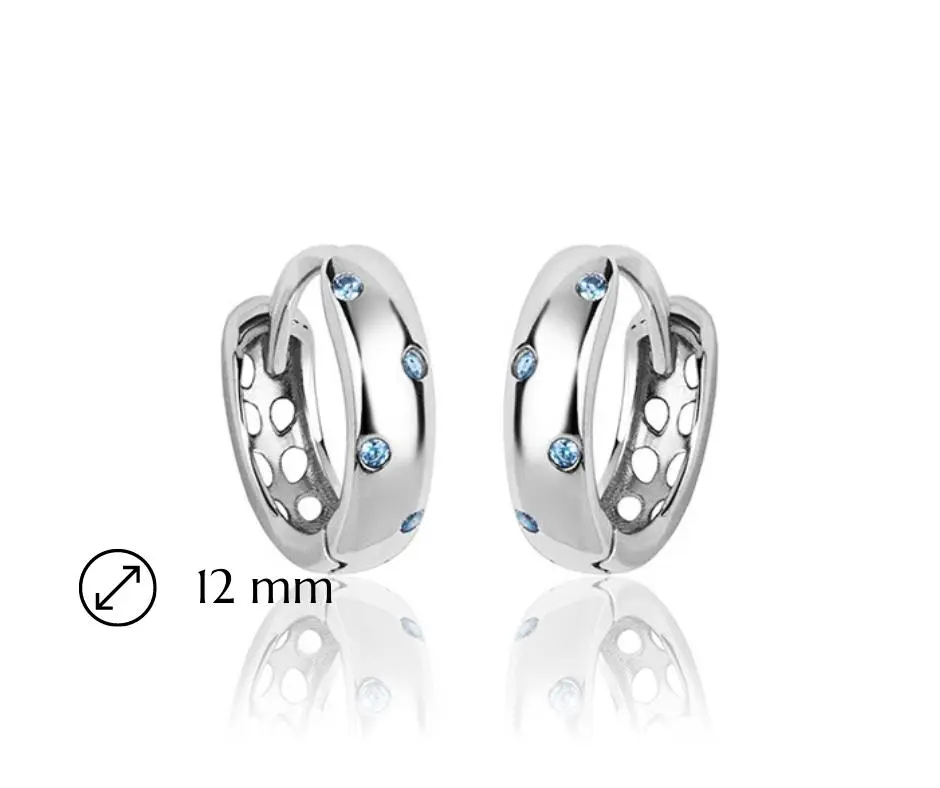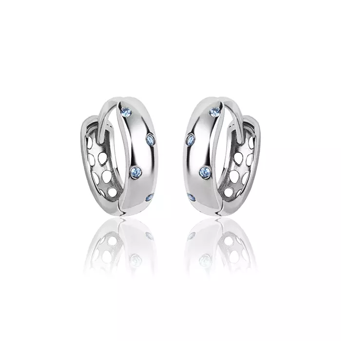 Srebrne kolczyki dla dziewczynki kreolki ozdobione błękitnymi cyrkoniami, wykonane ze srebra próby 925, rodowane. Kolczyki posiadają zapięcie typu zatrzask. Kolczyki kółka z cyrkoniami są nie tylko piękne, ale także wszechstronne, są bardzo uniwersalne i mogą być noszone zarówno na co dzień, jak i na specjalne okazje. Biżuteria ta jest doskonałą propozycją na prezent dla dziewczynki z okazji urodzin, imienin lub świąt. Kolczyki nie zawierają niklu, przez co nie uczulają i nie powodują reakcji alergicznej.