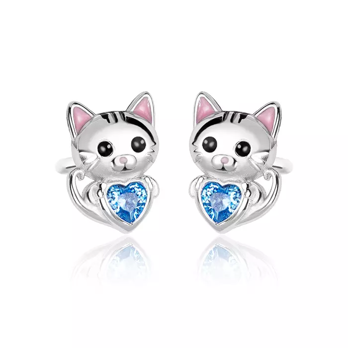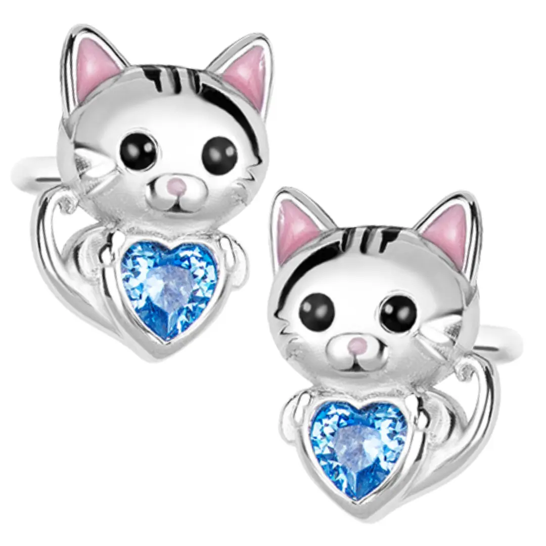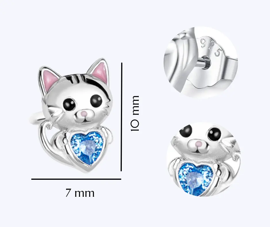 Srebrne kolczyki kotki dla dziewczynki, wykonane ze srebra próby 925, oprawione błękitną cyrkonią, która dodaje blasku. Biżuteria posiada zapięcie typu sztyft/wkrętki, bardzo praktyczne i bezpieczne. Wyróżnia się dużą stabilnością i wygodą noszenia. Kolczyki w kształcie kotów to urocza i zabawna biżuteria, która cieszy się dużą popularnością wśród dzieci, lubiących te puchate zwierzątka. Dzięki tym kolczykom dziecko z pewnością wyrazi miłość do ukochanego czworonoga. Biżuteria nie zawiera niklu, przez co nie uczula i nie powoduje reakcji alergicznej.