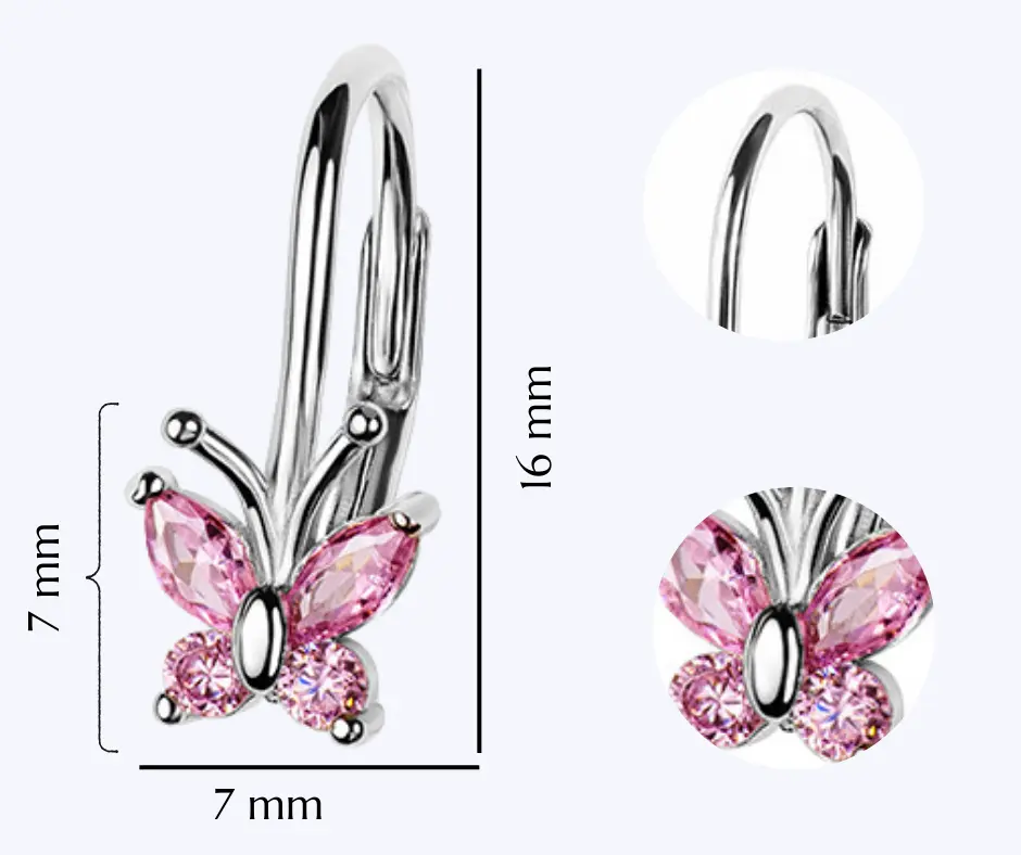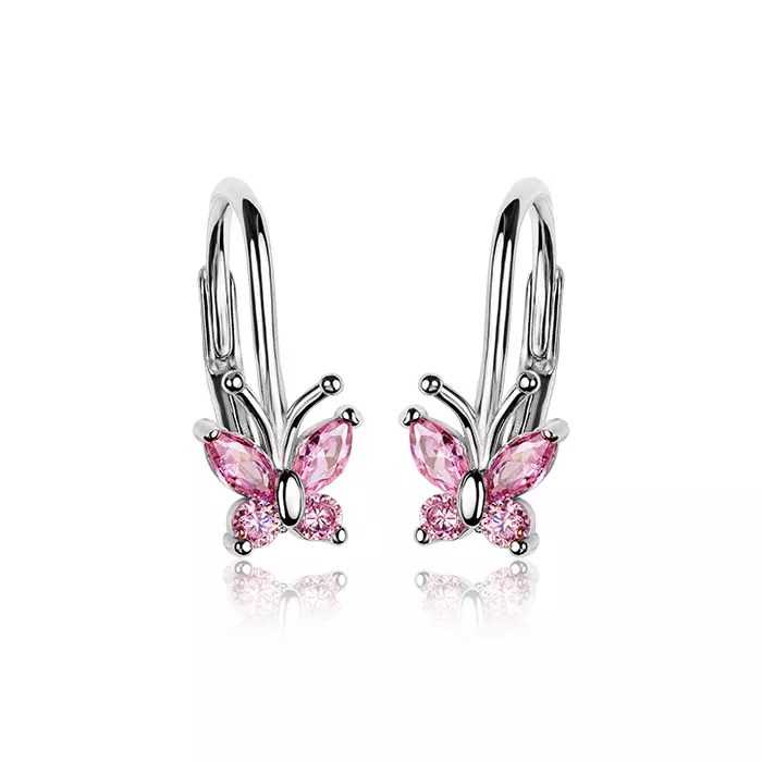 Piękne kolczyki dla dziewczynki motylki, wykonane z najwyższej jakości srebra rodowanego pr. 925. Kolczyki oprawione, diamentowymi różowymi cyrkoniami, które nadają im pięknego blasku. Biżuteria posiada zapięcie typu bigiel angielski klasyczny, bardzo praktyczne i bezpieczne. Kolczyki w kształcie motylków to urocza i delikatna biżuteria, która jest często wybierana ze względu na swoją lekkość i subtelność. Piękne kolczyki idealne do wielu letnich stylizacji dla dzieci i kobiet. Kolczyki zostały zabezpieczone procesem rodowania co sprawia, że kolczyki pięknie się błyszczą i cechują się dużą odpornością na uszkodzenia i niekorzystne oddziaływanie środowiska. Biżuteria nie zawiera niklu, przez co nie uczula i nie powoduje reakcji alergicznej.