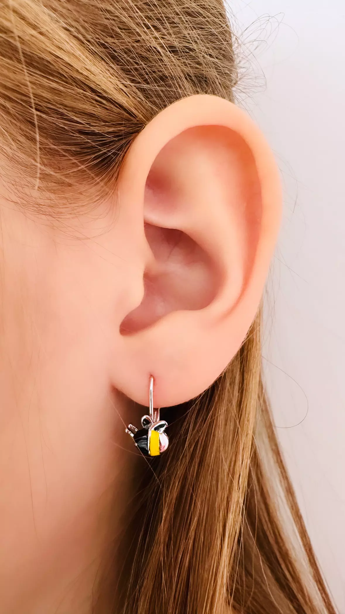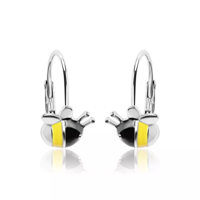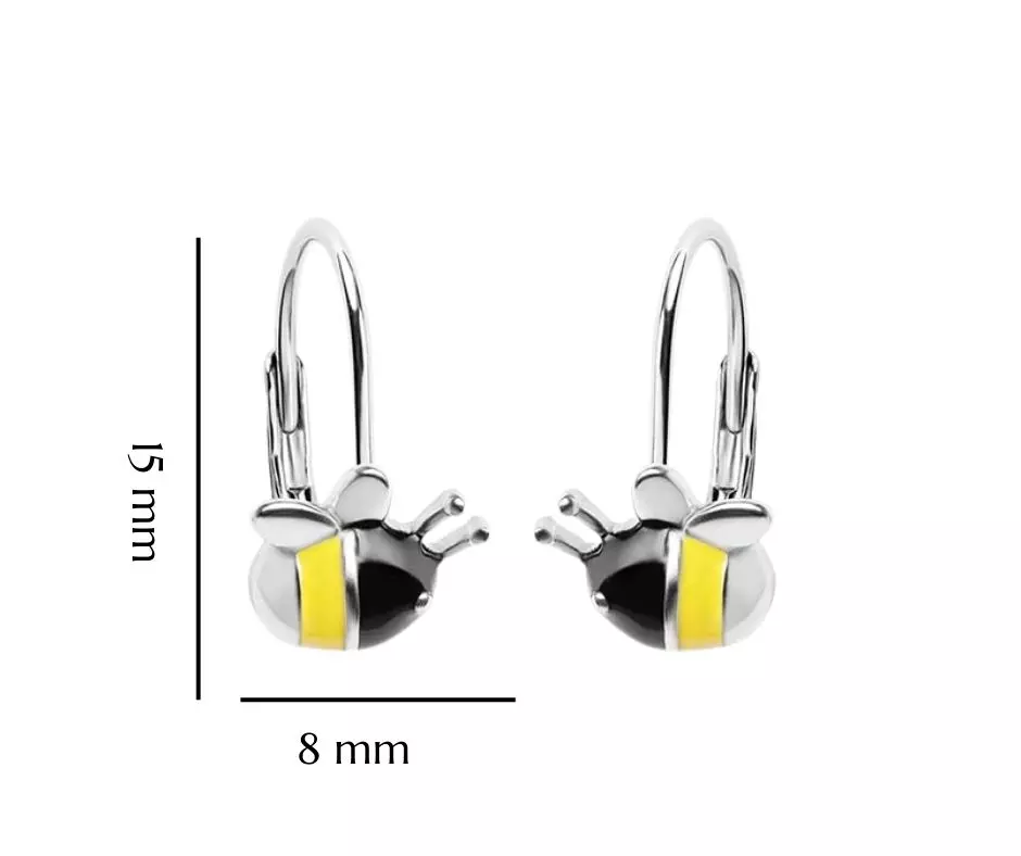 Srebrne kolczyki pszczółki dla dziewczynki, wykonane ze srebra próby 925, pokryte zostały kolorową emalią, w kolorze żółtym i czarnym. Kolczyki posiadają praktyczne zapięcie typu bigiel angielski. Kolczyki w kształcie pszczółek to wspaniała propozycja dla miłośników przyrody, natury, które pasują do każdej dziecięcej stylizacji. Kolczyki zostały zabezpieczone procesem rodowania co sprawia, że kolczyki pięknie się błyszczą i cechują się dużą odpornością na uszkodzenia i niekorzystne oddziaływanie środowiska. Biżuteria nie zawiera niklu, przez co nie uczula i nie powoduje reakcji alergicznej.