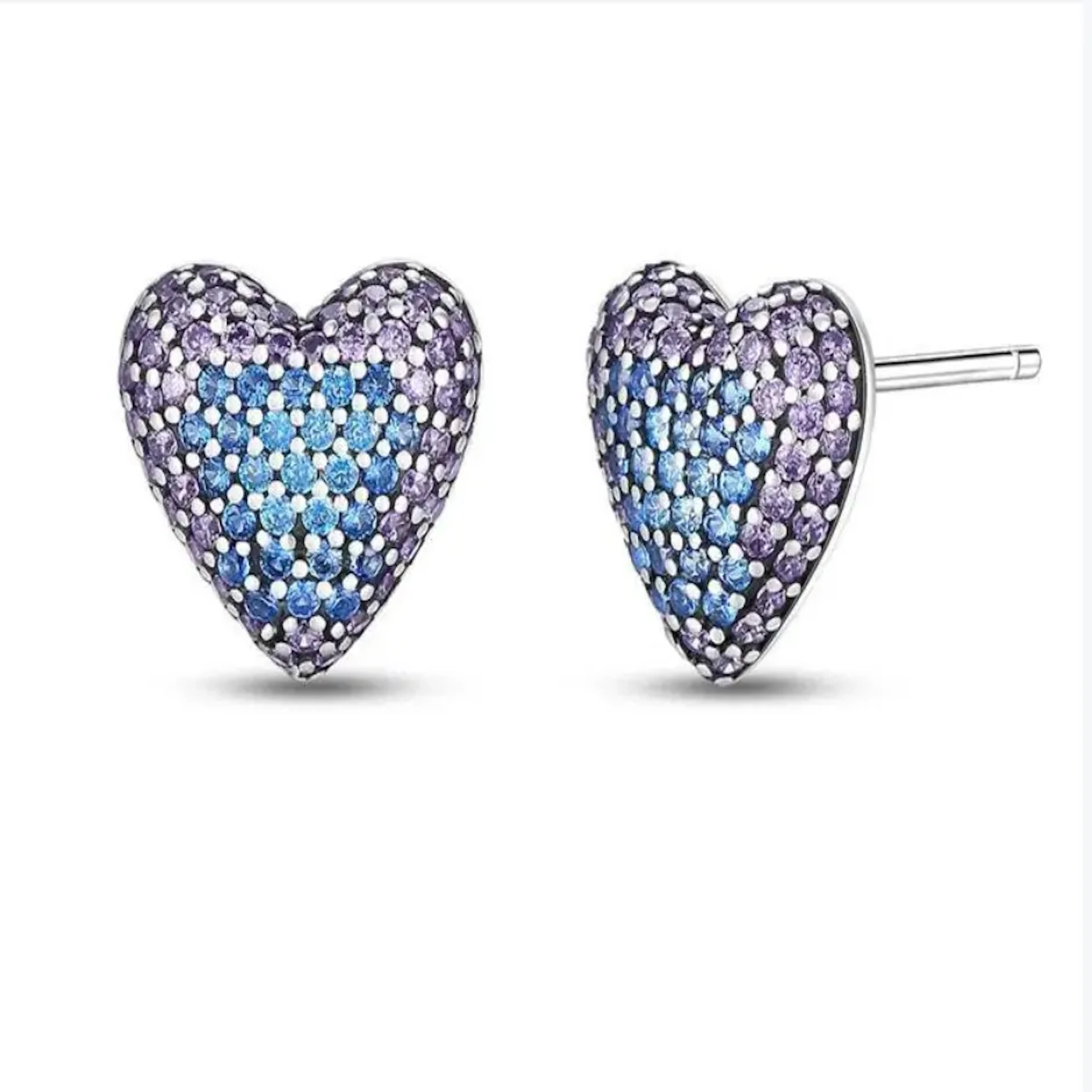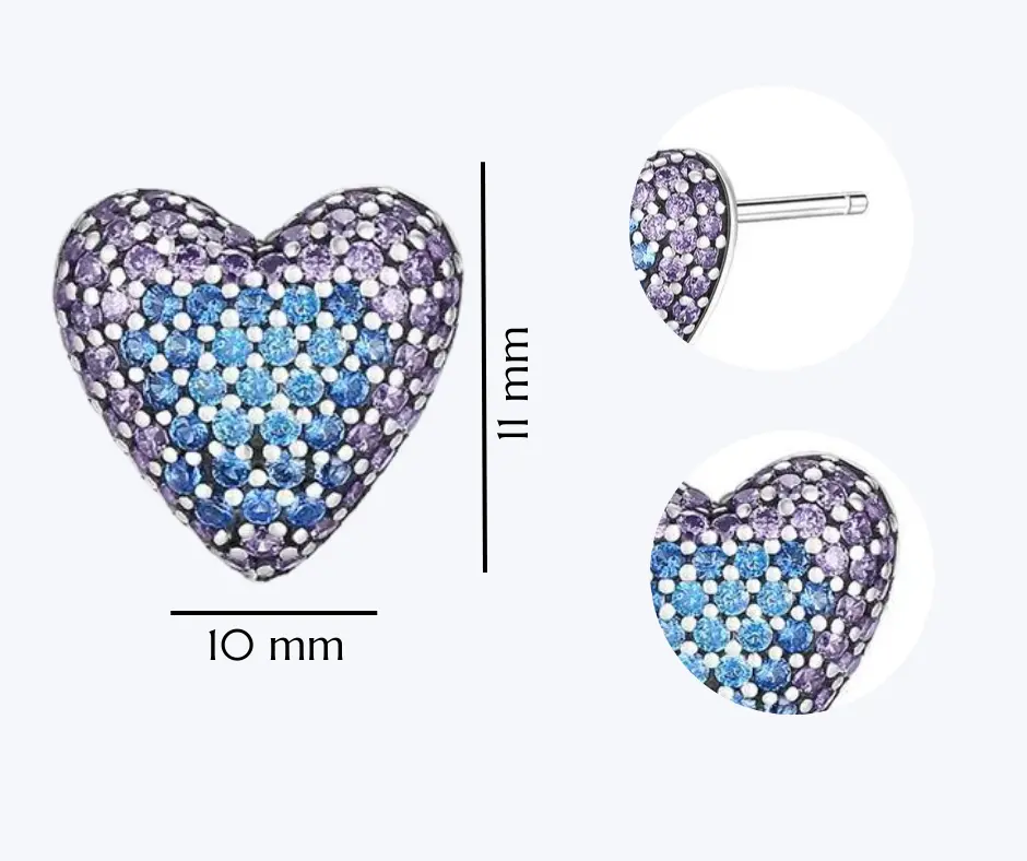 Piękne kolczyki serca wykonane z najwyższej jakości srebra rodowanego próby 925. Wysadzane lśniącymi fioletowo - niebieskimi cyrkoniami. Biżuteria posiada zapięcie typu sztyft, bardzo praktyczne i wygodne. Serce to popularny i ponadczasowy motyw w biżuterii, ponieważ symbolizuje miłość i romantyzm. Biżuteria ta jest doskonałą propozycją na prezent dla kobiet i dzieci z wielu różnych okazji np. urodzin, imienin, a także z okazji Walentynek lub Rocznicy Ślubu. Biżuteria srebrna z powłoką rodowania zapobiega ciemnieniu i matowieniu. Chroni biżuterię przed uszkodzeniami i zarysowaniami. Biżuteria rodowana zachowuje swój piękny blask i kolor. Nie zawiera niklu, nie uczula i nie powoduje alergii.