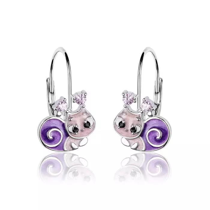 Srebrne kolczyki ślimaczki dla dziewczynki, wykonane zostały ze srebra próby 925, zostały pokryte fioletową emalią. Ślimaczkowe rogi oprawione zostały różowymi cyrkoniami. Posiadają zapięcie typu bigiel angielski, który jest idealnie dopasowany do dziecięcego uszka. Kolczyki w kształcie ślimaków to urocza i zabawna biżuteria, która pasuje do każdej dziecięcej stylizacji. Biżuteria ta jest doskonałą propozycją na prezent dla dzieci z wielu różnych okazji. Kolczyki nie zawierają niklu, przez co nie uczulają i nie powodują reakcji alergicznej.