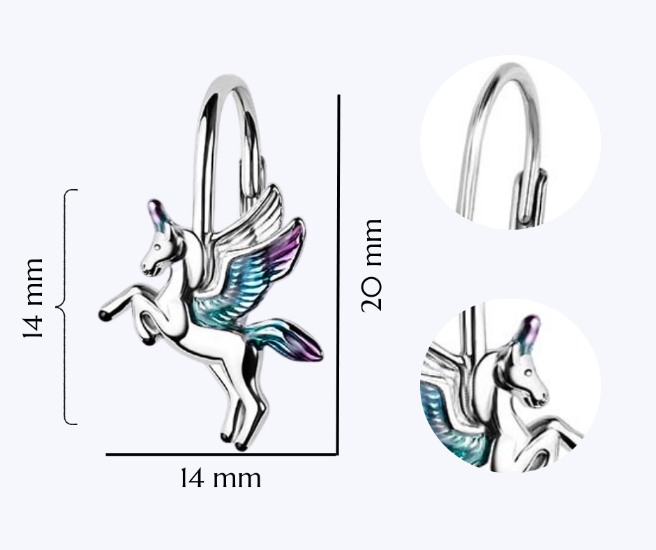 Srebrne kolczyki jednorożce dla dziewczynki, wykonane zostały ze srebra próby 925, pokryte emalią. Kolczyki posiadają zapięcie typu angielskiego, które jest idealnie dopasowane do dziecięcego uszka. Kolczyki w kształcie jednorożców to urocza i kreatywna biżuteria, która cieszy się dużą popularnością wśród dzieci, lubiących magię, fantazję i mitologiczne stworzenia. Jednorożce uważane są za symbol szczęścia, czystości i siły. Biżuteria ta jest doskonałą propozycją na prezent dla dziewczynki z okazji urodzin, imienin lub świąt. Kolczyki nie zawierają niklu, przez co nie uczulają i nie powodują reakcji alergicznej.