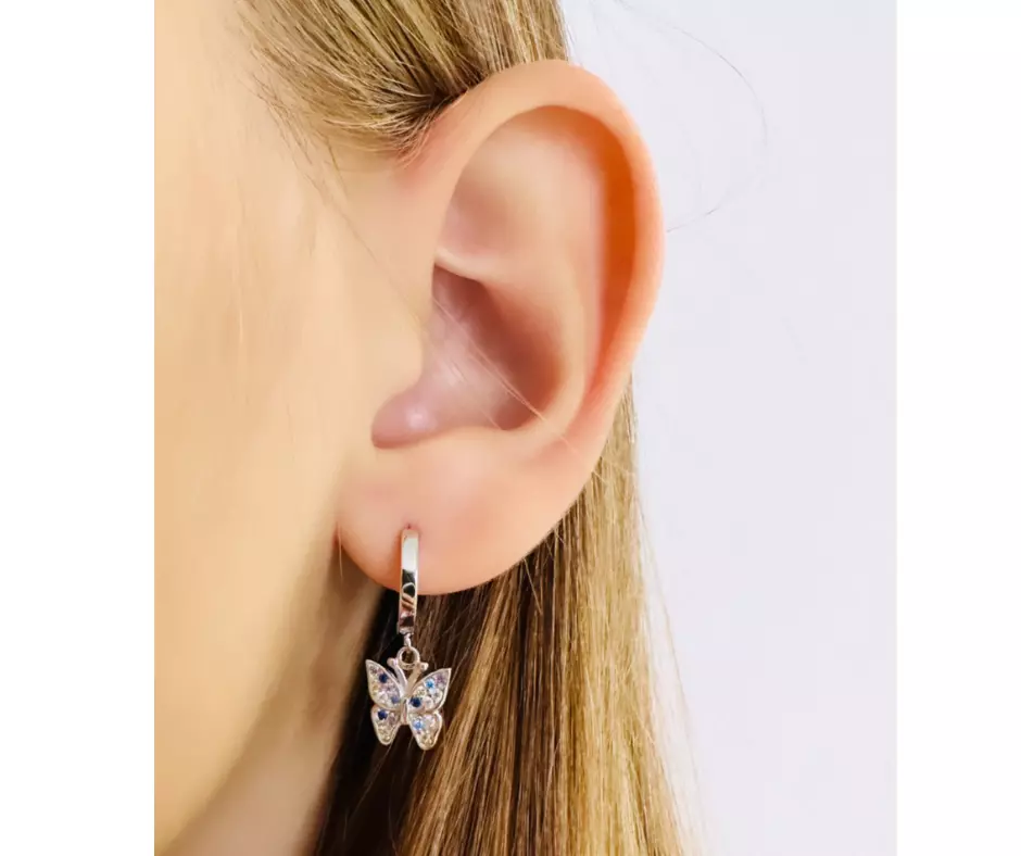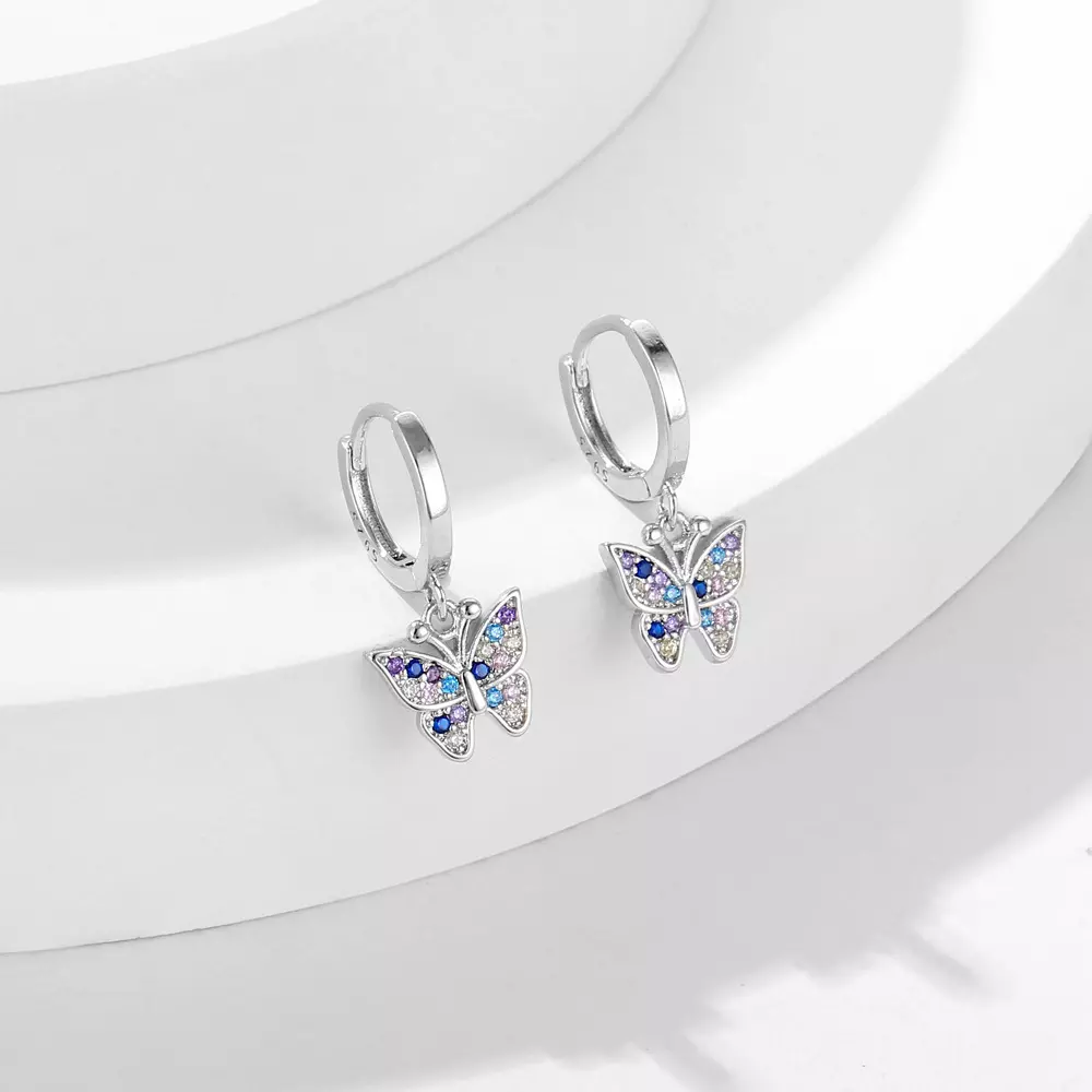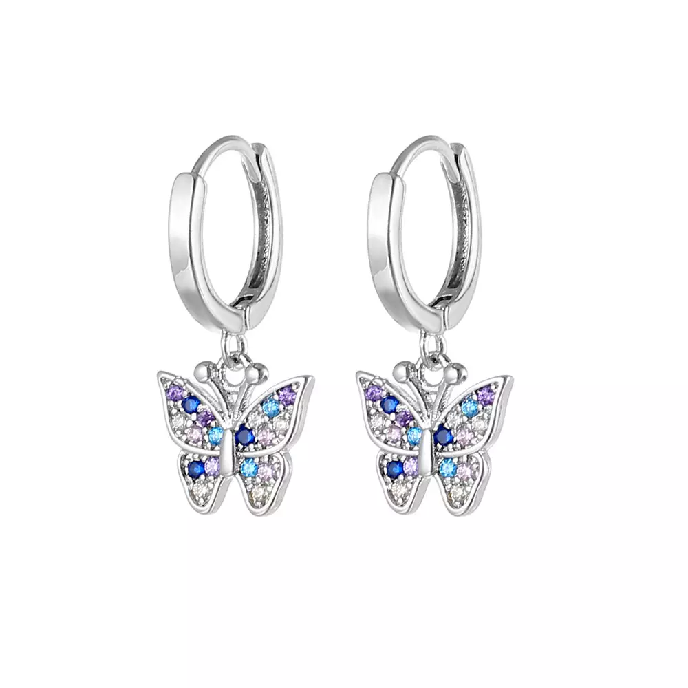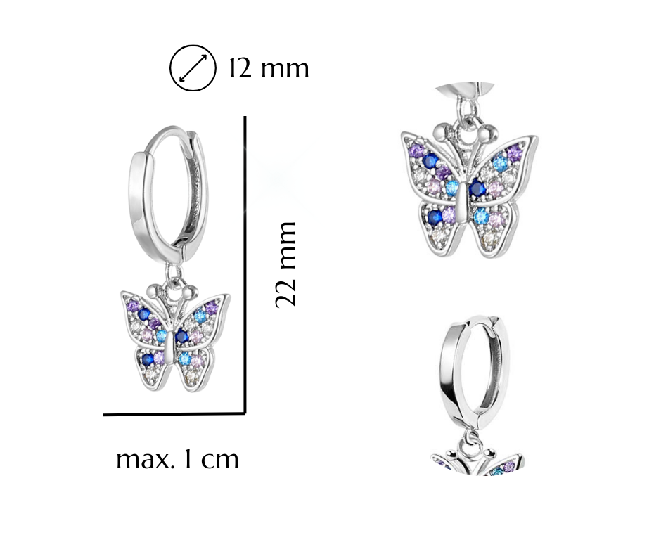 Srebrne kolczyki motylki/ kółka dla dziewczynki, wykonane z najlepszej jakości srebra rodowanego próby 925. Kolczyki oprawione zostały kolorowymi lśniącymi diamentowymi cyrkoniami. Kolczyki z zawieszką w kształcie motylków to urocza i delikatna biżuteria, która jest często wybierana ze względu na swoją lekkość i subtelność. Biżuteria ta jest doskonałą propozycją na prezent dla dzieci z wielu różnych okazji. Kolczyki nie zawierają niklu, przez co nie uczulają i nie powodują reakcji alergicznej.