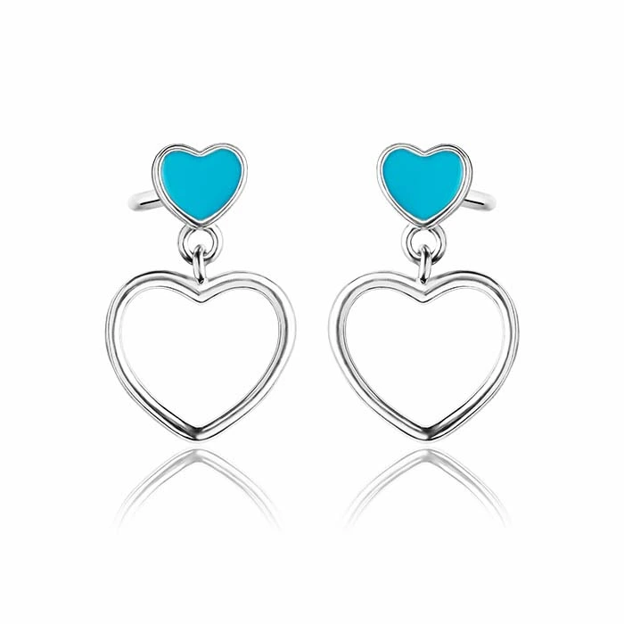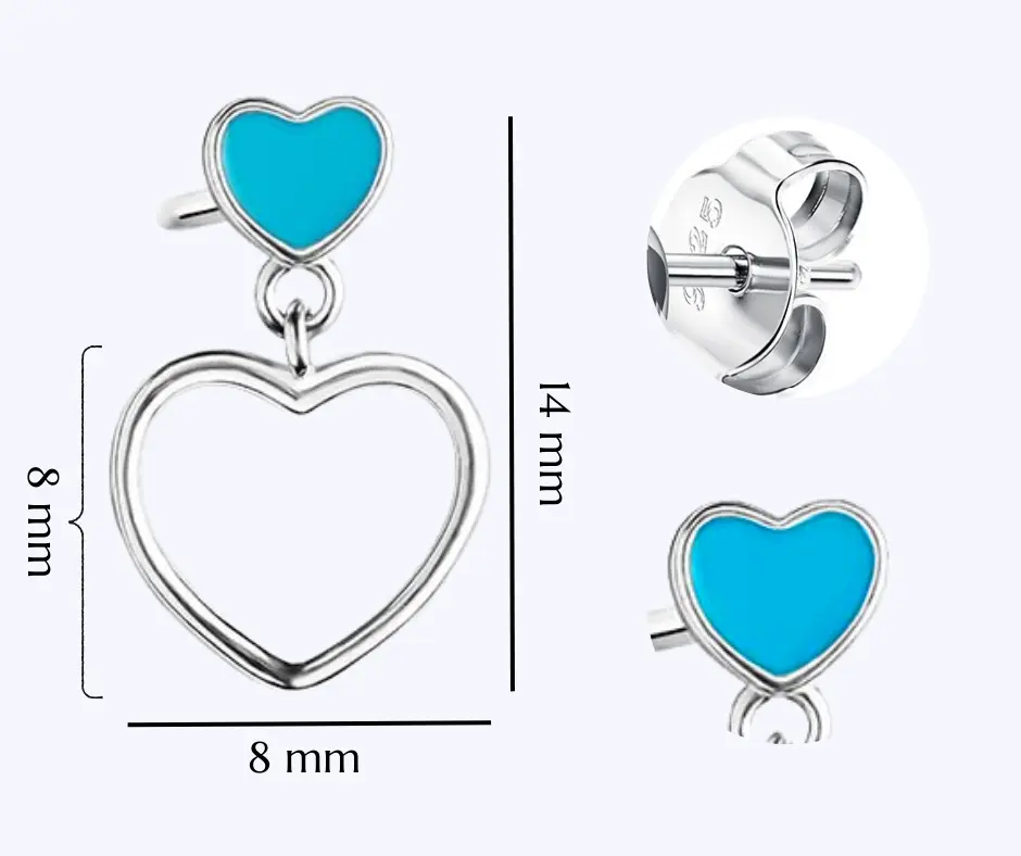Urocze kolczyki serca dla dziewczynki, wykonane zostały ze srebra rodowanego próby 925, pokryte niebieską emalią. Kolczyki posiadają zapięcie typu sztyft, które jest bardzo wygodne i praktyczne. Piękne kolczyki z wiszącym sercem to idealne dodatek wielu stylizacji, przyciągają uwagę swoim urokiem i delikatnością. Zawieszka w kształcie serca to absolutny HIT! Biżuteria ta jest doskonałą propozycją na prezent dla dzieci z wielu różnych okazji np. urodzin, imienin lub świąt! Kolczyki zostały zabezpieczone procesem rodowania co sprawia, że kolczyki pięknie się błyszczą i cechują się dużą odpornością na uszkodzenia i niekorzystne oddziaływanie środowiska. Biżuteria nie zawiera niklu, przez co nie uczula i nie powoduje reakcji alergicznej.