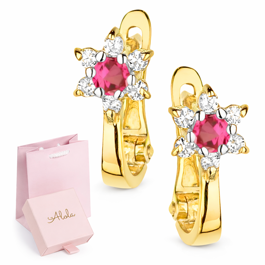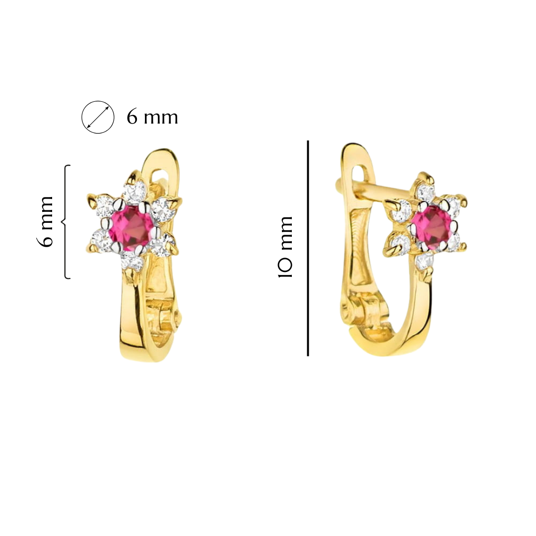 Każdy kwiatuszek zdobi centralny kamień w kolorze fuksji, otoczony małymi, lśniącymi cyrkoniami, które dodają blasku i podkreślają elegancję. Wykonane z wysokiej jakości złota próby 585, kolczyki są nie tylko piękne, ale także trwałe i bezpieczne dla delikatnych uszu dziecka. Angielskie zapięcie zapewnia komfort noszenia oraz chroni przed przypadkowym zgubieniem.