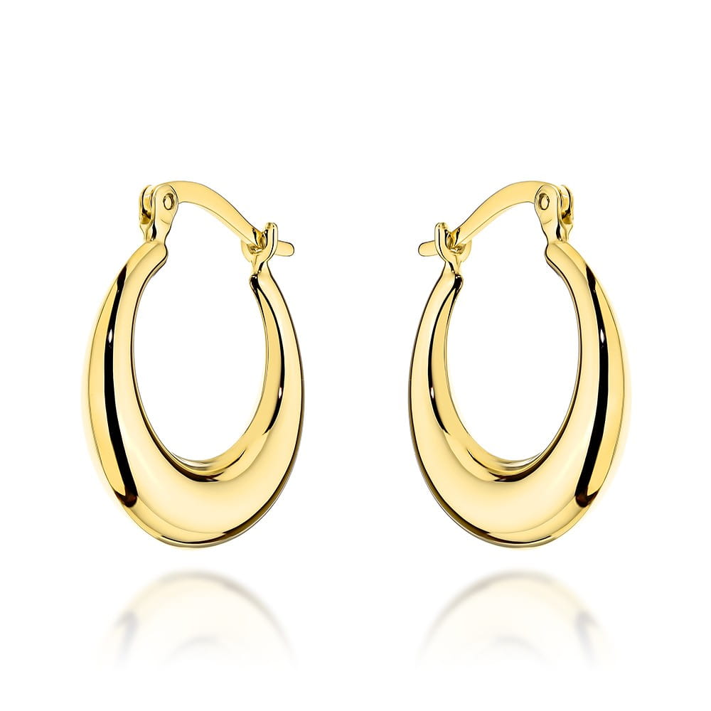 Kolczyki zostały wykonane ze złota próby 585, czyli 14-karatowego, co gwarantuje trwałość, piękny, ciepły kolor oraz jakość potwierdzoną standardami jubilerskimi. Gładkie polerowane kolczyki pięknie odbijają światło, a zaokrąglona szyna nadaje im miękką, elegancką formę. Średnica około 18,8 mm sprawia, że są widoczne, ale nadal subtelne i bardzo komfortowe w noszeniu. Angielskie zapięcie zapewnia bezpieczeństwo i wygodę, dlatego kolczyki świetnie sprawdzą się także przy dłuższym użytkowaniu.