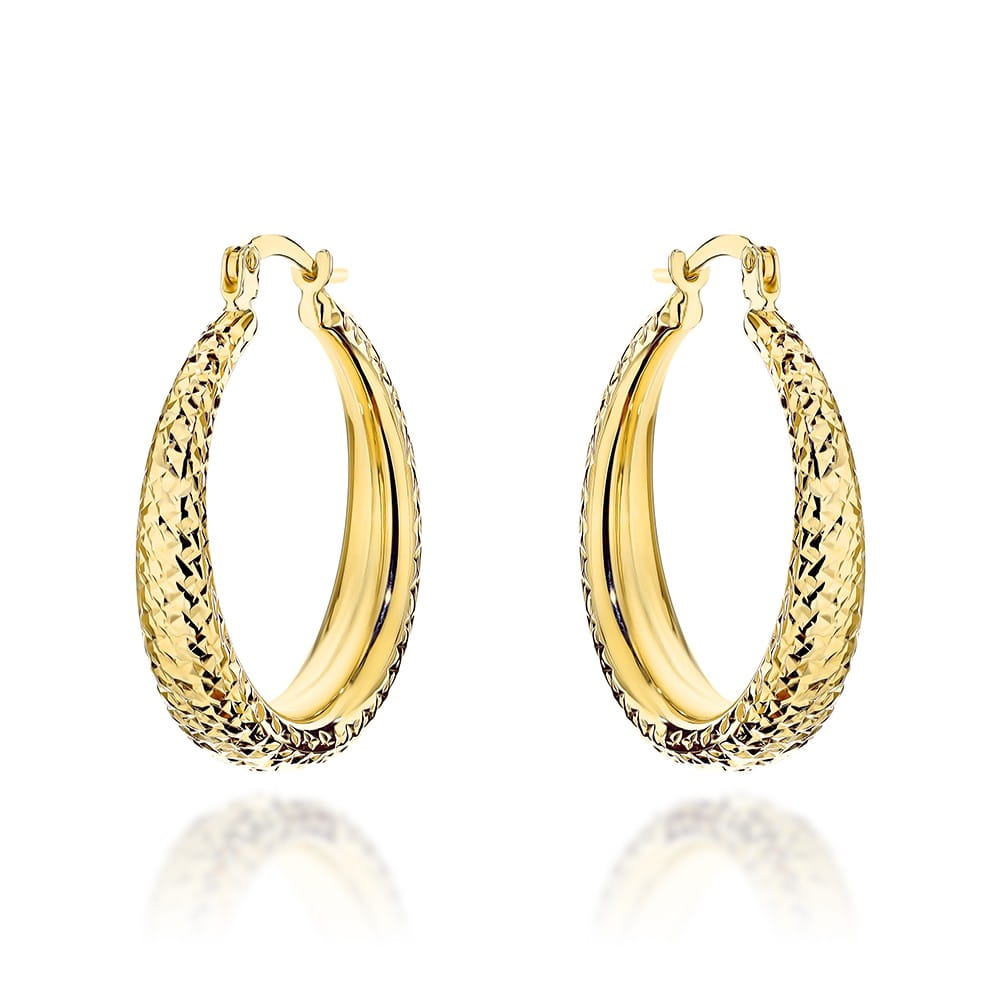 Podaruj sobie lub bliskiej osobie kolczyki, które łączą w sobie elegancję, blask i niezawodną jakość. Wybierz złote koła z diamentowaną strukturą i ciesz się biżuterią, która zawsze robi wrażenie.