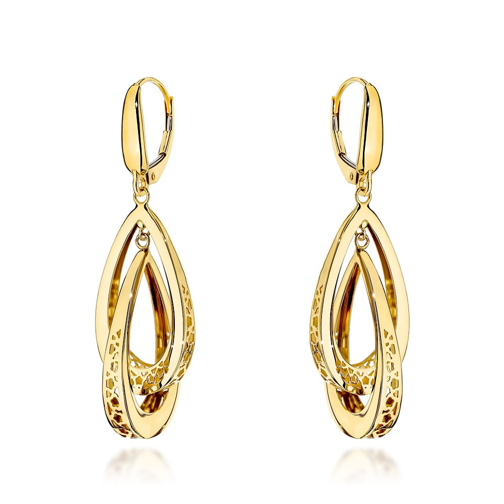 Kamień Bez kamienia Wzór Romb Materiał Złoto Kolor złota Żółty  Próba 585 Szerokość łezek [mm] ok. 5,60-14,00 Wysokość górnej łezki [mm] ok. 25,20 Wysokość dolnej łezki [mm] ok. 23,40 Długość kolczyka z zapięciem [mm] ok. 48,00 Te szykowne, wiszące kolczyki o geometrycznym charakterze zachwycają nowoczesnym designem i subtelnym blaskiem. Ich dopracowana forma porusza się z lekkością, delikatnie połyskując przy każdym ruchu, subtelnie rozpraszając światło w starannie wykonanych detalach.   Geometryczne elementy układają się w harmonijną, elegancką kompozycję, która łączy minimalistyczną estetykę z wyrazistym akcentem. To biżuteria, która doskonale dopełnia różne zestawy — od codziennych, po te na wyjątkowe okazje. Łączy w sobie ponadczasową elegancję z artystycznym wyrazem, dzięki czemu idealnie sprawdzi się zarówno w klasycznych, jak i bardziej odważnych stylizacjach.Zajmujemy się sprzedażą biżuterii ze złota. Sprzedajemy towary pochodzące od krajowych i zagranicznych producentów. Wszystkie produkty pochodzą z legalnego źródła. Wystawiamy faktury VAT.