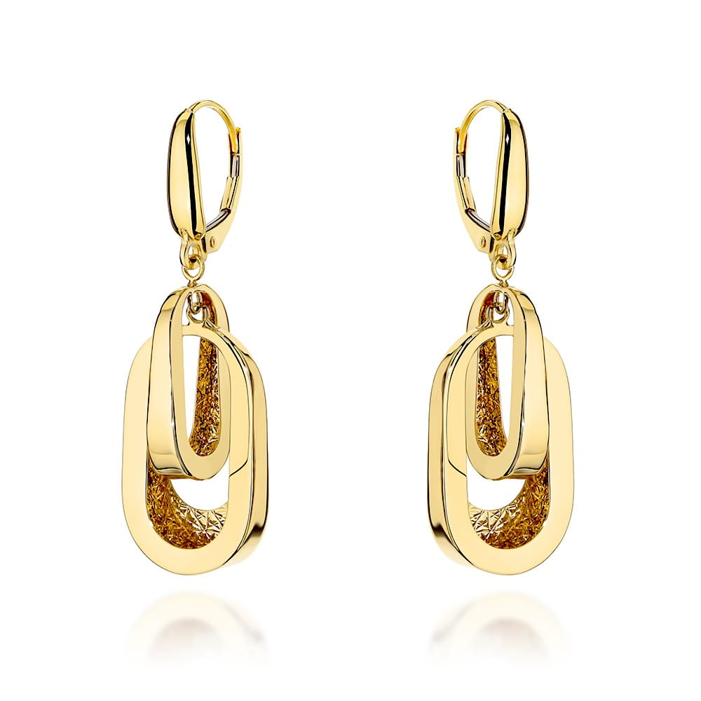 Kamień Bez kamienia Wzór Owal Materiał Złoto Kolor złota Żółty  Próba 585 Szerokość małego owalu [mm] ok. 11,00 Wysokość małego owalu [mm] ok. 17,60 Szerokość dużego owalu [mm] ok. 14,70 Wysokość dużego owalu [mm] ok. 22,50 Długość kolczyka z zapięciem [mm] ok. 43,00 Te szykowne, wiszące kolczyki o geometrycznym charakterze zachwycają nowoczesnym designem i subtelnym blaskiem. Ich dopracowana forma porusza się z lekkością, delikatnie połyskując przy każdym ruchu, subtelnie rozpraszając światło w starannie wykonanych detalach.   Geometryczne elementy układają się w harmonijną, elegancką kompozycję, która łączy minimalistyczną estetykę z wyrazistym akcentem. To biżuteria, która doskonale dopełnia różne zestawy — od codziennych, po te na wyjątkowe okazje. Łączy w sobie ponadczasową elegancję z artystycznym wyrazem, dzięki czemu idealnie sprawdzi się zarówno w klasycznych, jak i bardziej odważnych stylizacjach.Zajmujemy się sprzedażą biżuterii ze złota. Sprzedajemy towary pochodzące od krajowych i zagranicznych producentów. Wszystkie produkty pochodzą z legalnego źródła. Wystawiamy faktury VAT.