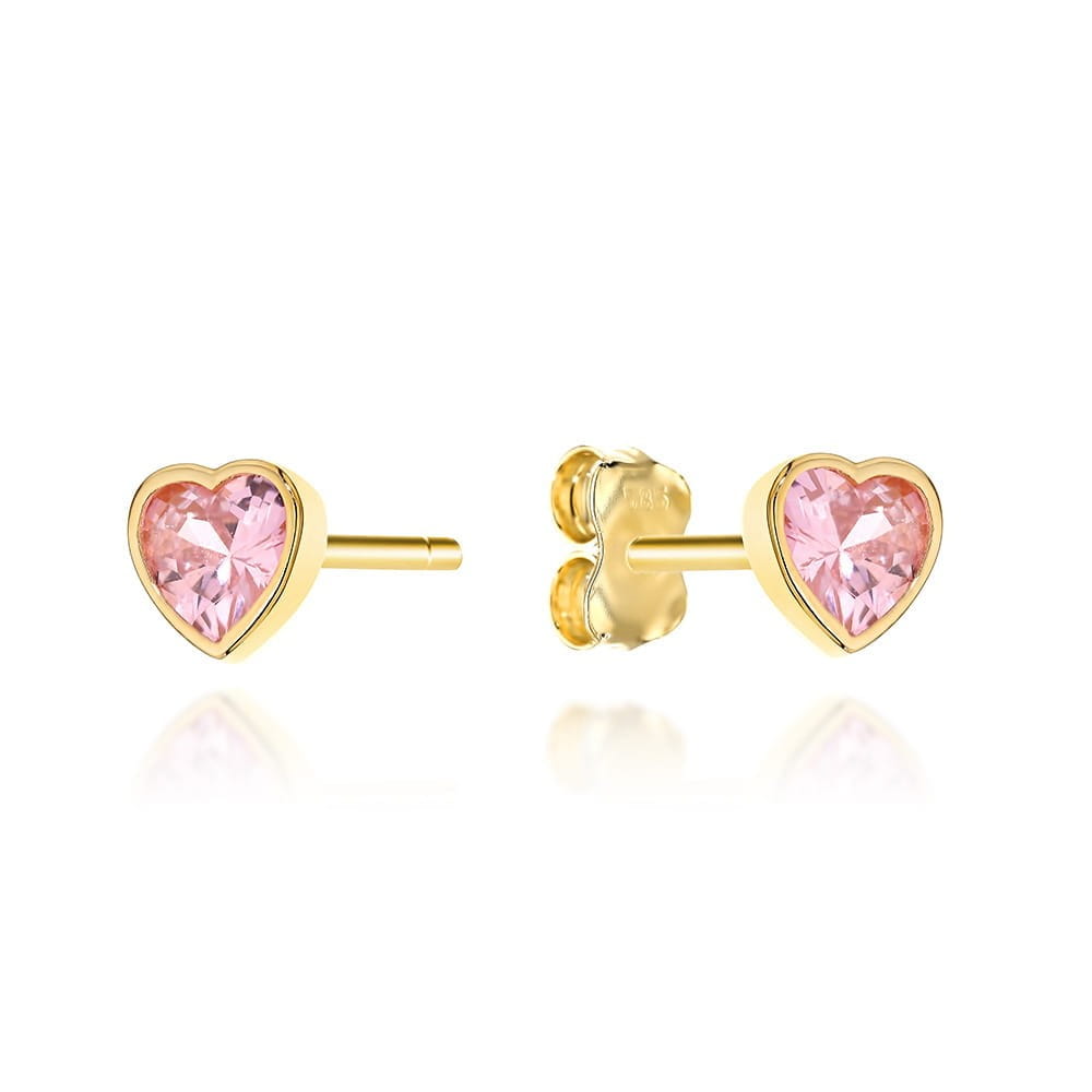 Kolczyki złote serduszka z różowym kamieniem dla dziewczynki na chrzest 585