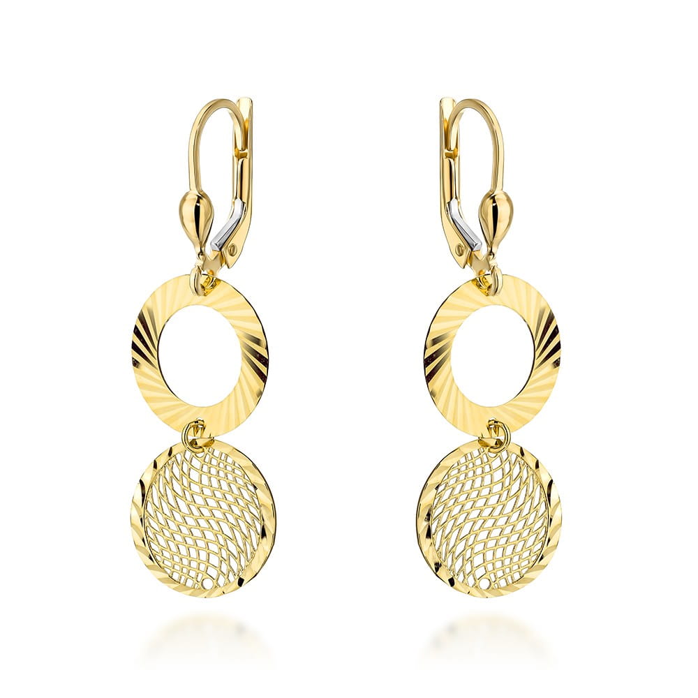 Kolczyki złote wiszące diamentowany ring i ażurowe kółko próba 585