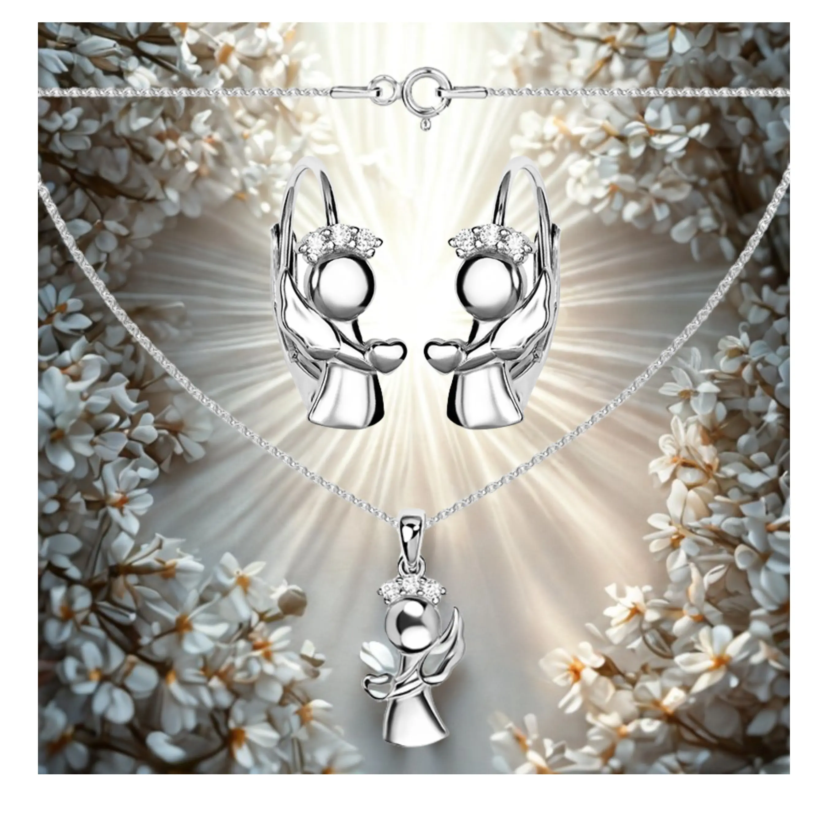 Komplet wykonany jest ze srebra próby 925 wysokiej jakości, zabezpieczonego procesem rodowania, który chroni biżuterię przed ciemnieniem i sprawia, że zachowuje piękny połysk przez długie lata. Aniołki zostały oprawione lśniącymi cyrkoniami, które subtelnie odbijają światło i dodają całości elegancji, nie tracąc przy tym dziecięcej delikatności. To bezpieczna i ponadczasowa biżuteria, idealna dla młodej użytkowniczki.