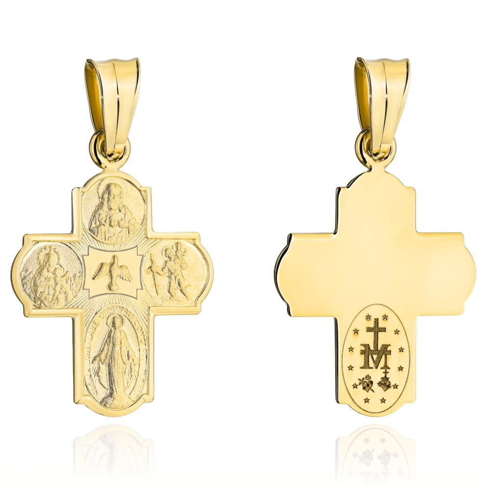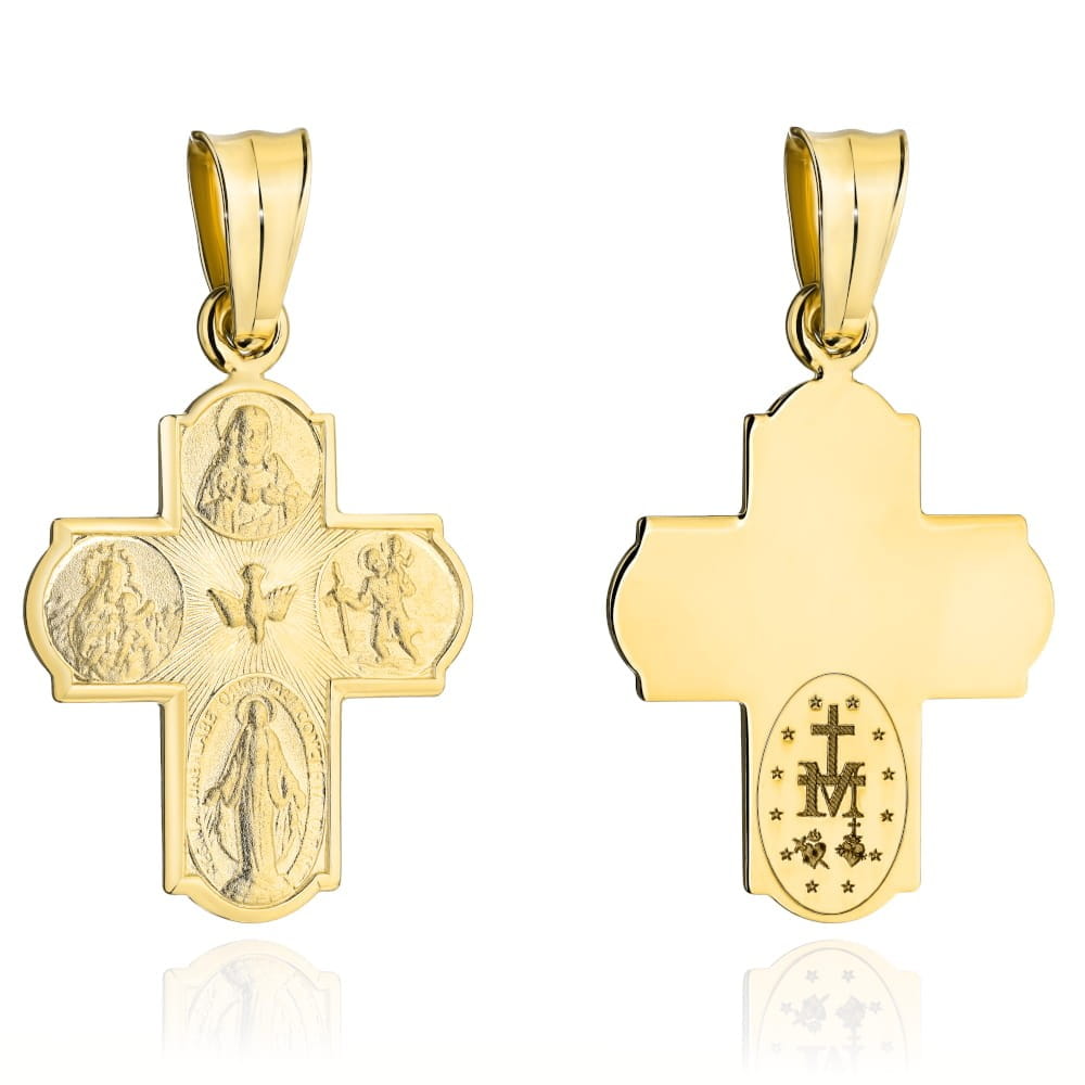 Wzór Krzyżyk Materiał Złoto Kolor złota Żółty Próba 585 Szerokość krzyża [mm] 12,8 Długość krzyża [mm] 26,3 Długość krzyża z zawieszką [mm] 36,7 Precyzyjnie wykonany złoty krzyżyk próby 585. Przedstawia cztery wizerunki : Serce Jezusa Chrystusa, Św. Krzysztofa, Cudowny Medalik, Matka Boska Z Dzieciątkiem oraz po środku Ducha Świętego. Pamiątka chrztu, pierwszej komunii, bierzmowania lub ważnego jubileuszu. Zajmujemy się sprzedażą biżuterii ze złota. Sprzedajemy towary pochodzące od krajowych i zagranicznych producentów. Wszystkie produkty pochodzą z legalnego źródła. Wystawiamy faktury VAT.