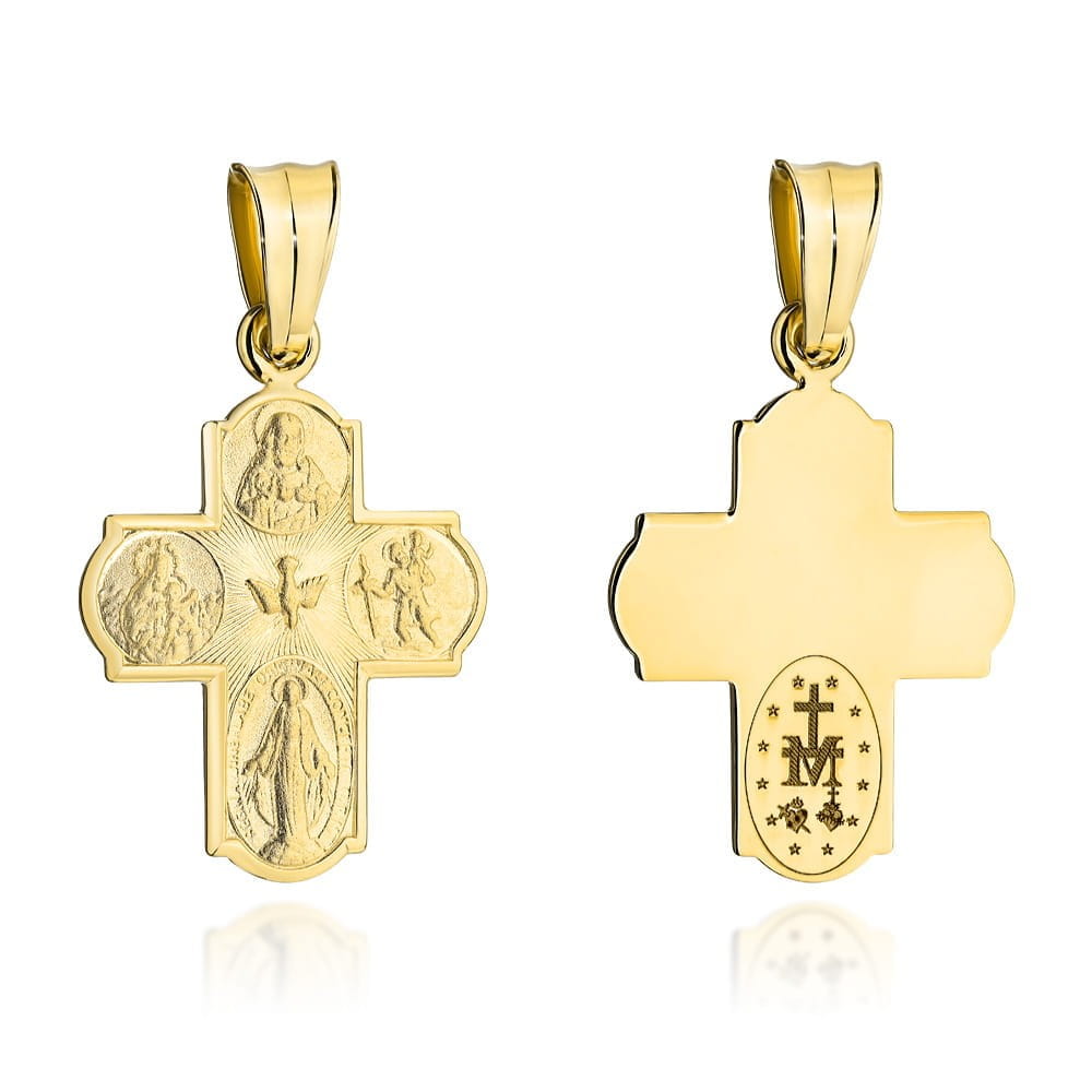 Wzór Krzyżyk Materiał Złoto Kolor złota Żółty Próba 585 Szerokość krzyża [mm] 16,3 Długość krzyża [mm] 19 Długość krzyża z zawieszką [mm] 27,5 Precyzyjnie wykonany złoty krzyżyk próby 585. Przedstawia cztery wizerunki : Serce Jezusa Chrystusa, Św. Krzysztofa, Cudowny Medalik, Matka Boska Z Dzieciątkiem oraz po środku Ducha Świętego. Pamiątka chrztu, pierwszej komunii, bierzmowania lub ważnego jubileuszu. Zajmujemy się sprzedażą biżuterii ze złota. Sprzedajemy towary pochodzące od krajowych i zagranicznych producentów. Wszystkie produkty pochodzą z legalnego źródła. Wystawiamy faktury VAT.