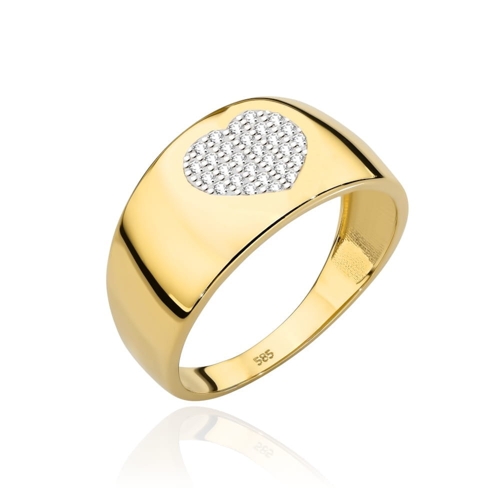 Pierścionek złoty szeroki z sercem wysadzanym cyrkoniami próba 585