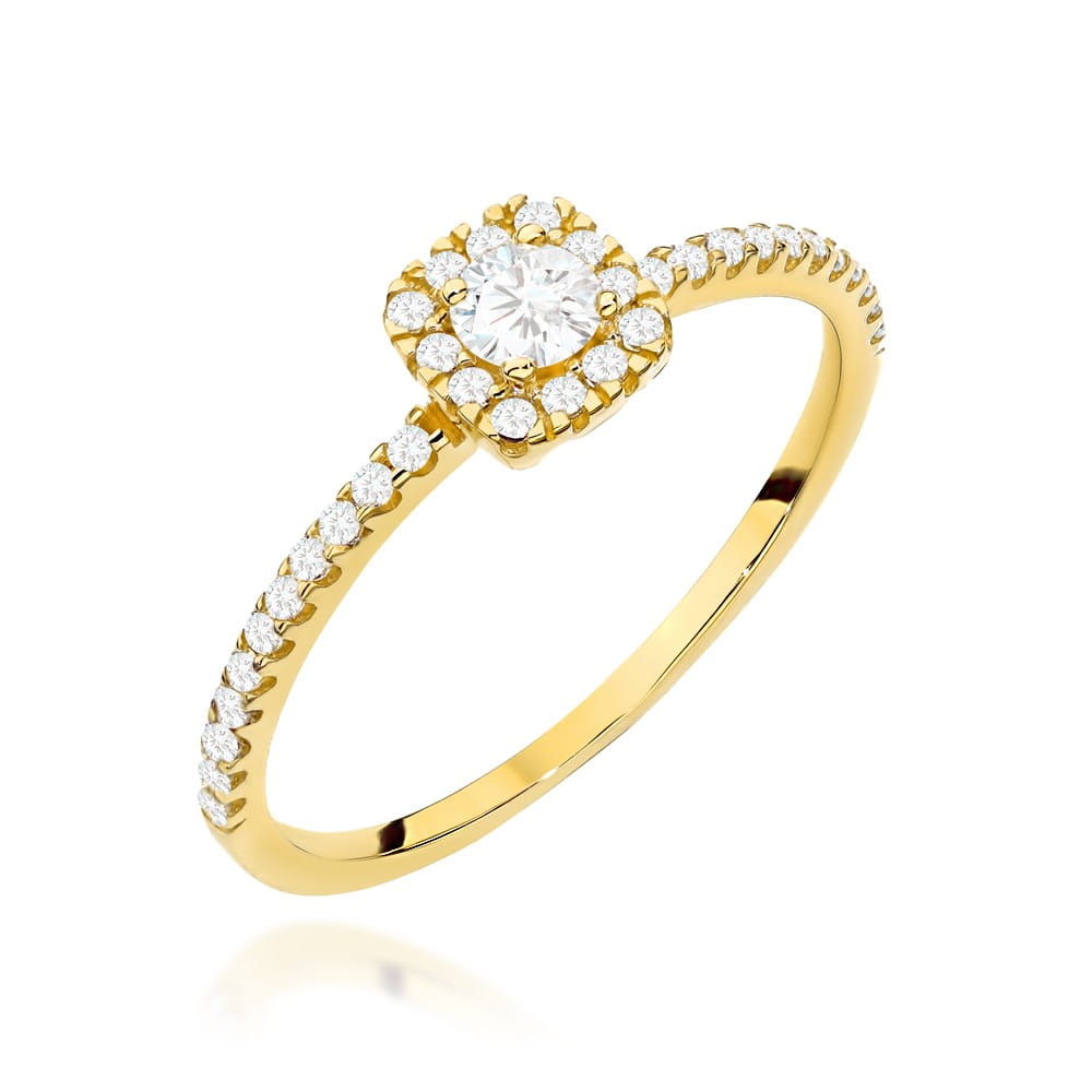 Pierścionek złoty z centralną cyrkonią w kwadracie zdobiony cyrkoniami 585