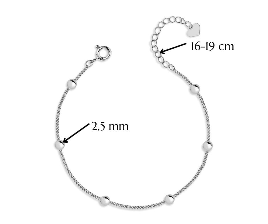 Bransoletka srebrna damska z kuleczkami wykonana z najlepszej jakości rodowanego srebra próby 925. Posiada możliwość regulacji zapięcia. Wyjątkowy design przyciąga uwagę szykiem, elegancją i nowoczesnym stylem. Stworzona z niezwykłą starannością i dbałością o szczegóły. Bransoletka z kulkami to uniwersalny dodatek do wielu kobiecych stylizacji. Piękny upominek dla kobiety, która lubi klasę i prostą elegancję. Bransoletka została zabezpieczona procesem rodowania co sprawia, że pięknie się błyszczy i cechuje dużą odpornością na uszkodzenia i niekorzystne oddziaływanie środowiska. Biżuteria nie zawiera niklu, nie uczula i nie powoduje alergii.