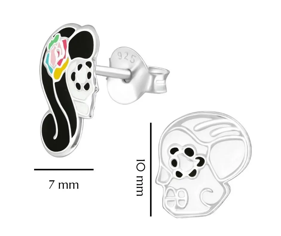Kolczyki srebrne czaszka dla dziewczynki, wykonane zostały ze srebra próby 925, ozdobione kolorową emalią. Kolczyki posiadają zapięcie typu sztyft, bardzo praktyczne i wygodne. Kolczyki z motywem meksykańskiej czaszki doskonale oddadzą ducha Halloween i pozwolą na wyrażenie swojej radości związanej z tą zabawną i nieco tajemniczą tradycją. Biżuteria ta jest uroczym dodatkiem do każdej dziecięcej Halloweenowej stylizacji. Biżuteria nie zawierają niklu, przez co nie uczulają i nie powodują reakcji alergicznej.