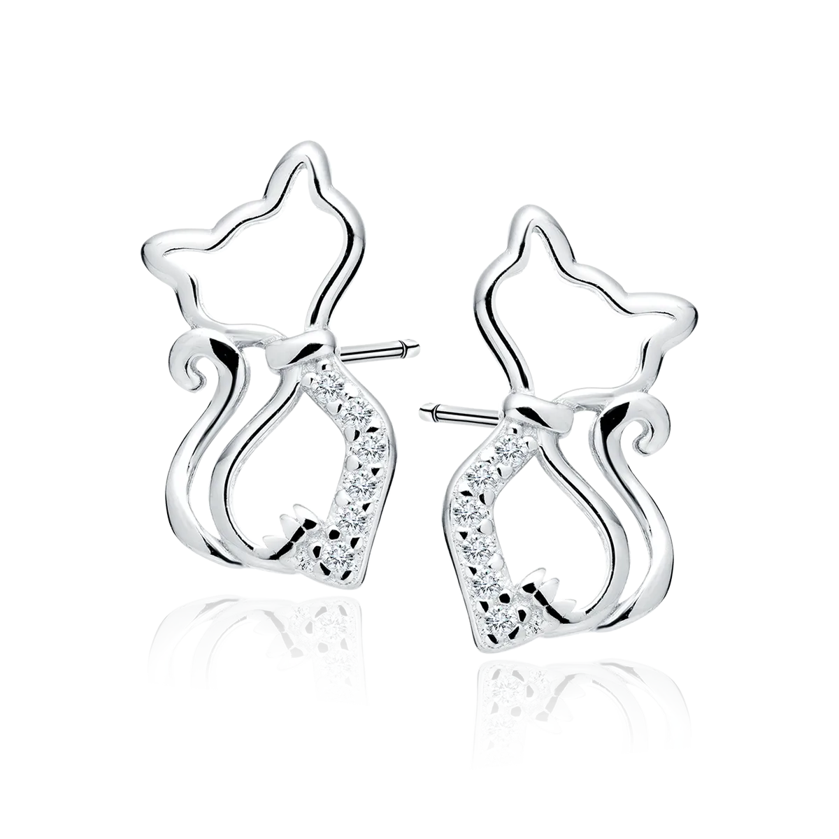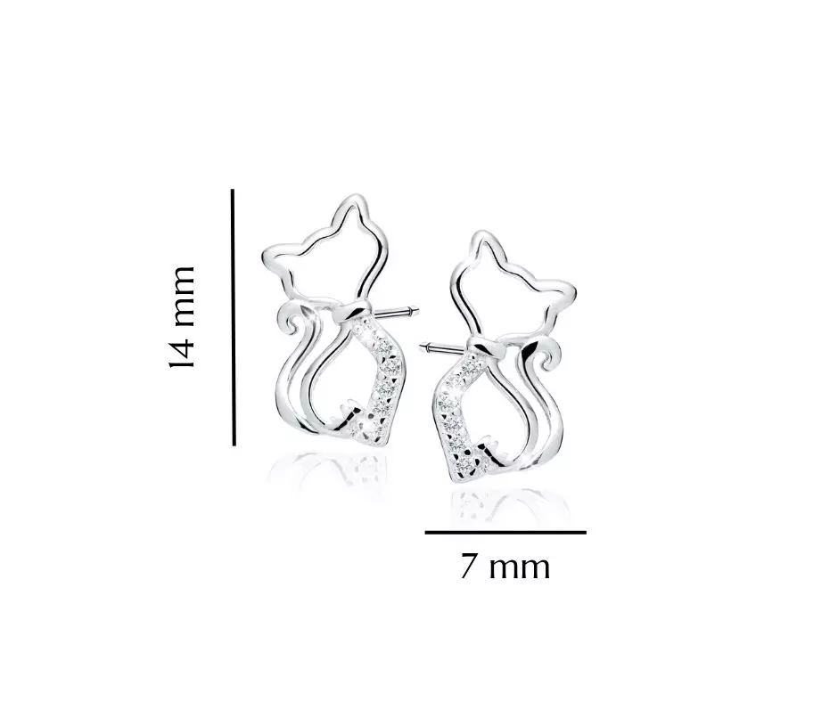 Srebrne kolczyki dla dziewczynki, kotki wykonane ze srebra próby 925, rodowane, oprawione zostały białymi cyrkoniami. Kolczyki posiadają zapięcie typu sztyft. Kolczyki w kształcie kotów to urocza i delikatna biżuteria, która jest często wybierana ze względu na swoją lekkość i subtelność. Idealny pomysł na prezent dla kobiet i dzieci z wielu różnych okazji urodzin, imienin lub świąt. Biżuteria srebrna z powłoką rodowania zapobiega ciemnieniu i matowieniu, Chroni biżuterię przed uszkodzeniami i zarysowaniami. Biżuteria rodowana zachowuje swój piękny blask i kolor.