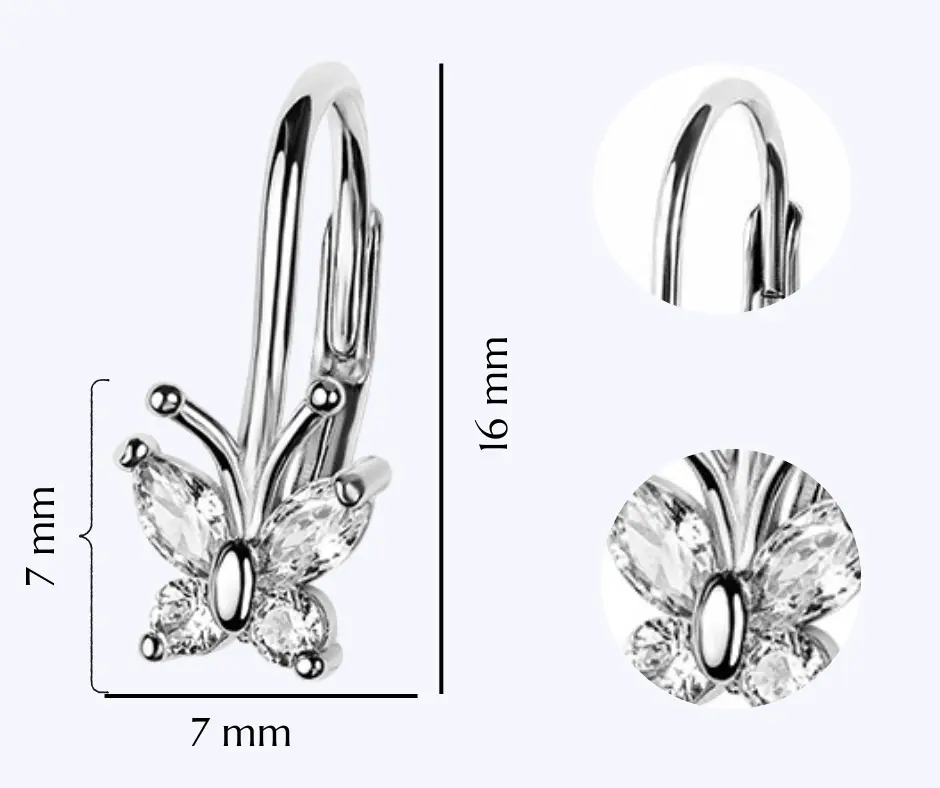 Piękne kolczyki dla dziewczynki motylki, wykonane z najwyższej jakości srebra rodowanego pr. 925. Kolczyki oprawione, diamentowymi białymi cyrkoniami, które nadają im pięknego blasku. Biżuteria posiada zapięcie typu bigiel angielski klasyczny, bardzo praktyczne i bezpieczne. Kolczyki w kształcie motylków to urocza i delikatna biżuteria, która jest często wybierana ze względu na swoją lekkość i subtelność. Piękne kolczyki idealne do wielu letnich stylizacji dla dzieci i kobiet. Kolczyki zostały zabezpieczone procesem rodowania co sprawia, że kolczyki pięknie się błyszczą i cechują się dużą odpornością na uszkodzenia i niekorzystne oddziaływanie środowiska. Biżuteria nie zawiera niklu, przez co nie uczula i nie powoduje reakcji alergicznej.