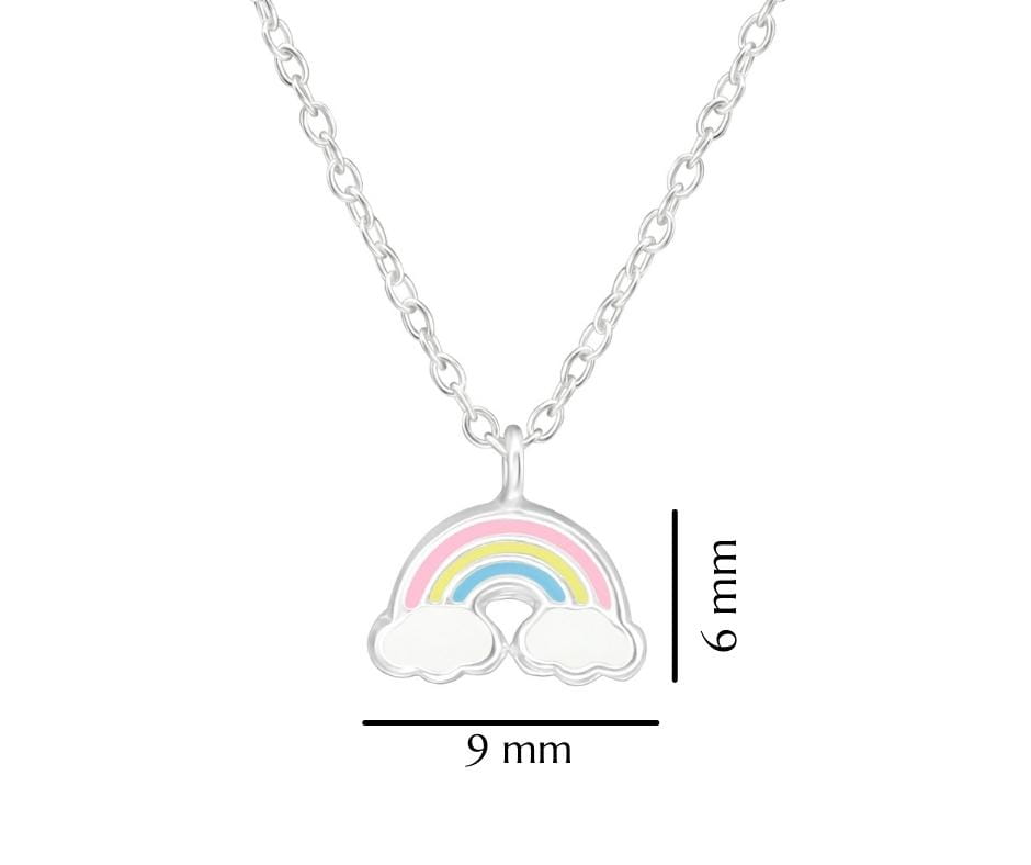 Srebrny łańcuszek dla dziewczynki z kolorową zawieszką w kształcie tęczy, wykonany został ze srebra próby 925. Zawieszka pokryta kolorową emalią. Jak wiadomo tęcza to symbol pokoju i harmonii, daje dobrą energię i jest bardzo lubianym dodatkiem do każdej dziecięcej stylizacji. Naszyjnik posiada regulację zapięcia. Biżuteria ta jest doskonałą propozycją na prezent z okazji urodzin, imienin lub świąt. W ofercie mamy również kolczyki oraz bransoletkę w kształcie tęczy, które w połączeniu z naszyjnikiem stworzą wyjątkowy i niepowtarzalny zestaw. Łańcuszek nie zawierają niklu, przez co nie uczulają i nie powodują reakcji alergicznej.