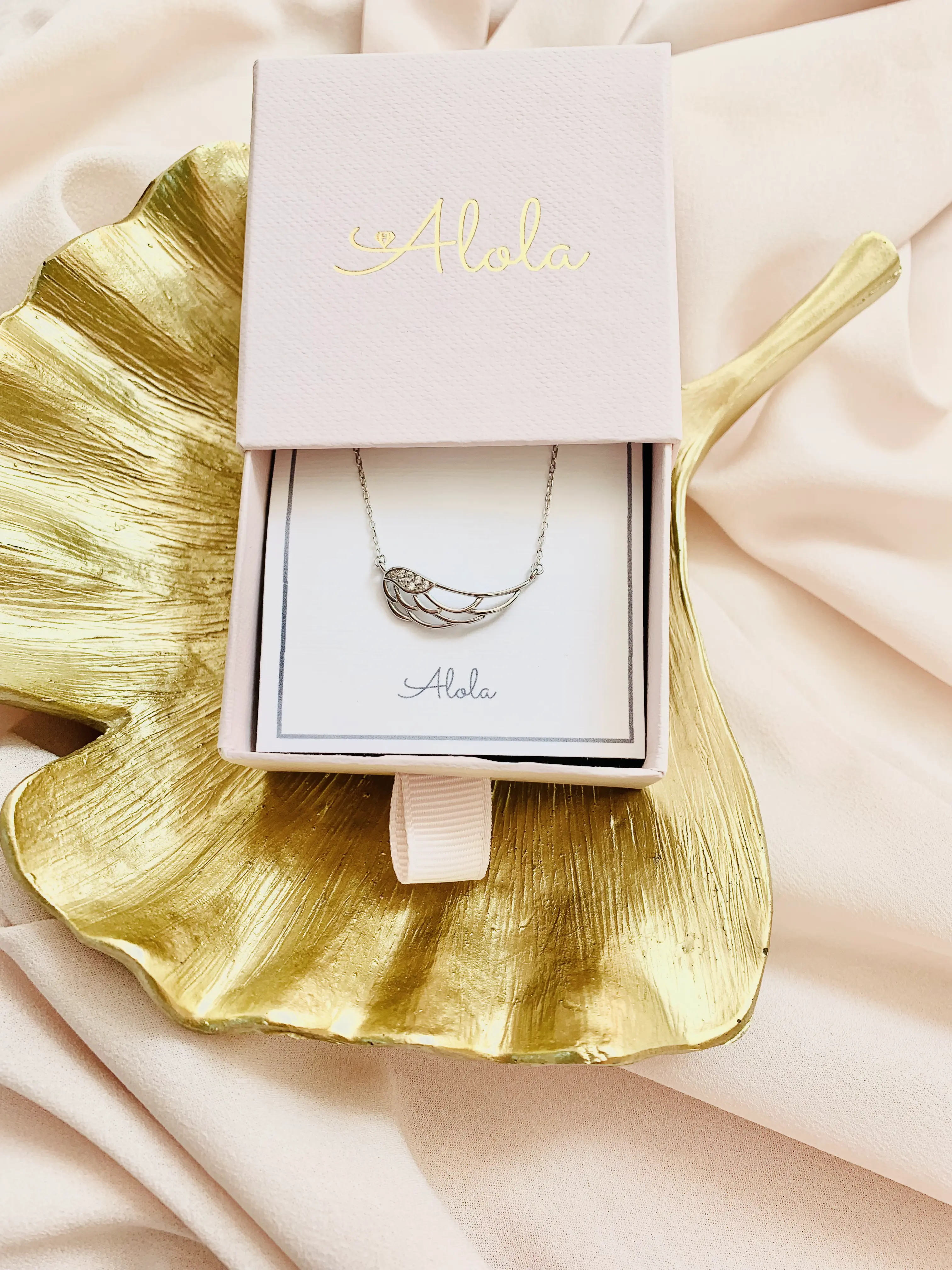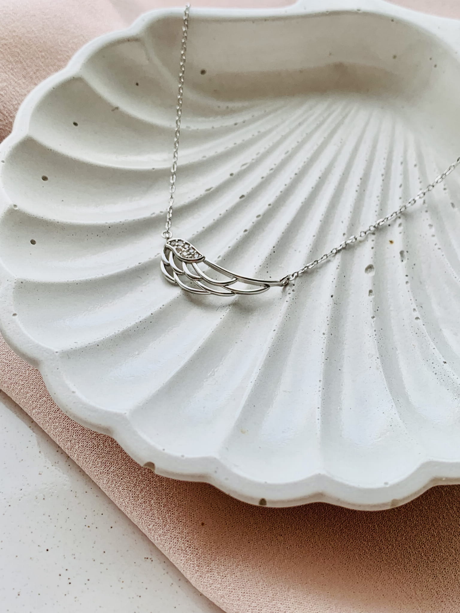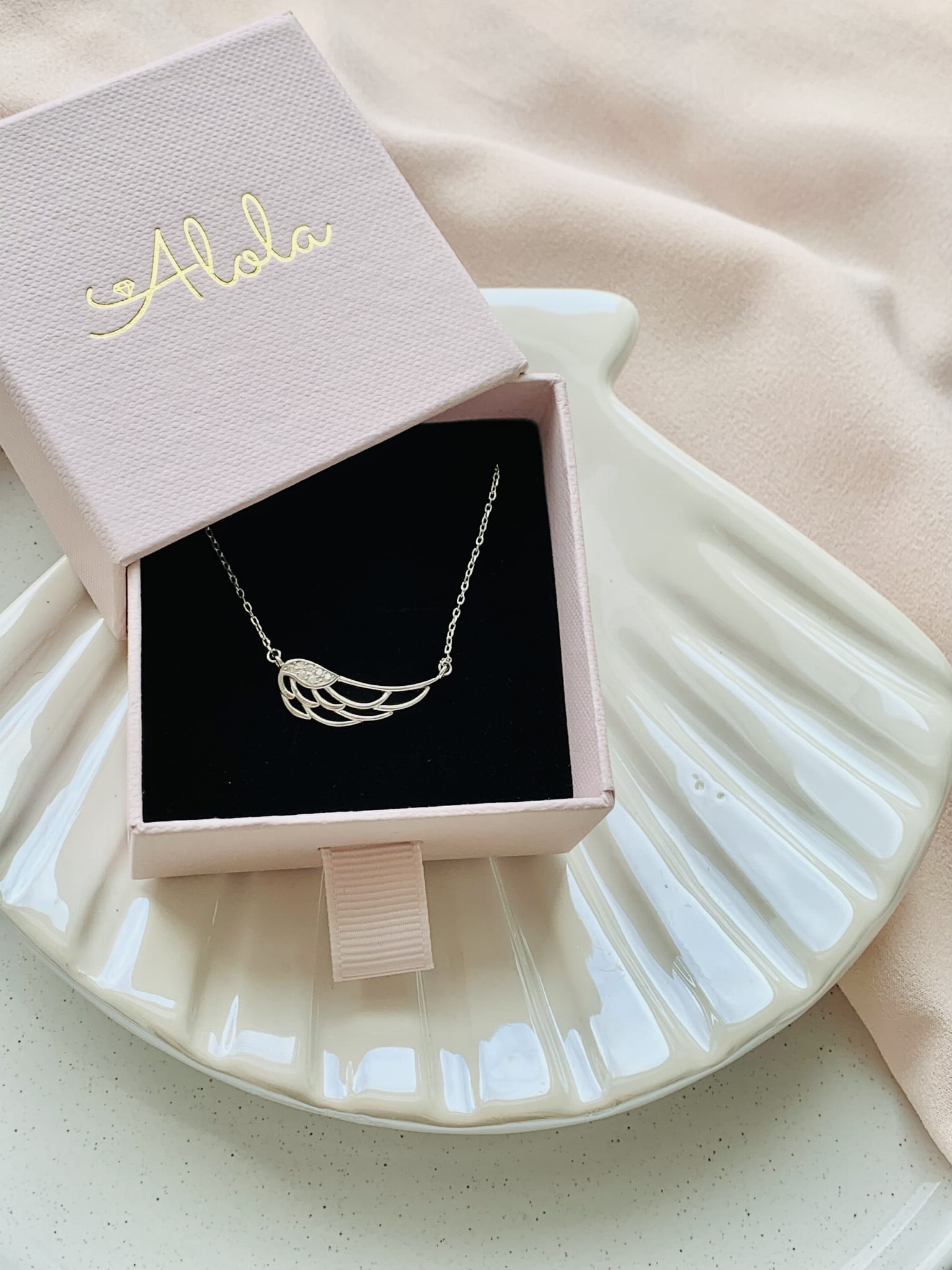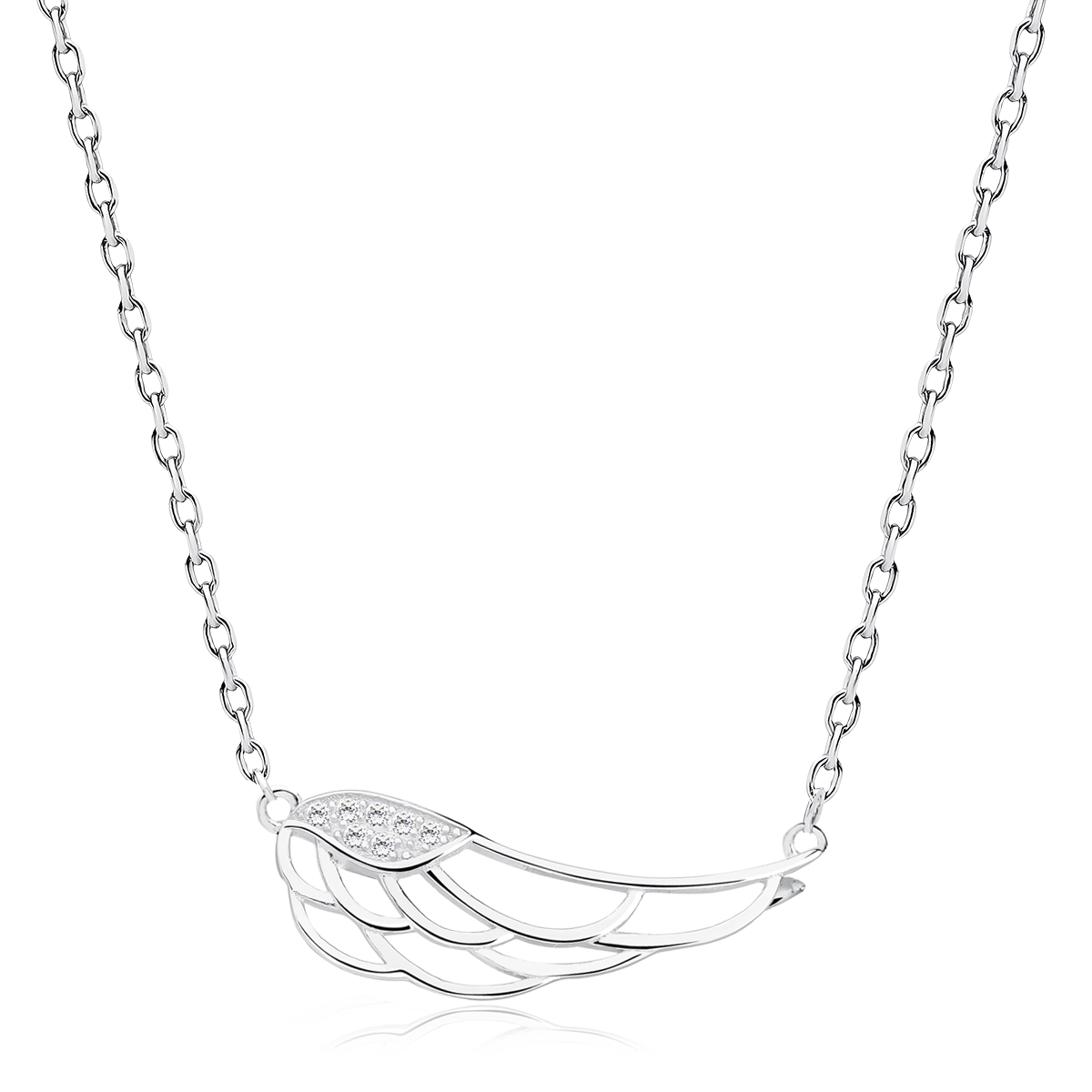Uroczy naszyjnik skrzydło Anioła wykonany z najlepszej jakości srebra rodowanego próby 925. Zawieszka została oprawiona białymi lśniącymi cyrkoniami, które nadają blasku. Długość naszyjnika regulowana. Naszyjnik w kształcie skrzydeł anioła to piękny i symboliczny dodatek, wyraz swobody, niezależności i wolności, który nadaje lekkości każdej stylizacji. Jest to doskonały pomysł na prezent dla kobiet z wielu różnych okazji. Biżuteria nie zawiera niklu, nie uczula i nie powoduje alergii.