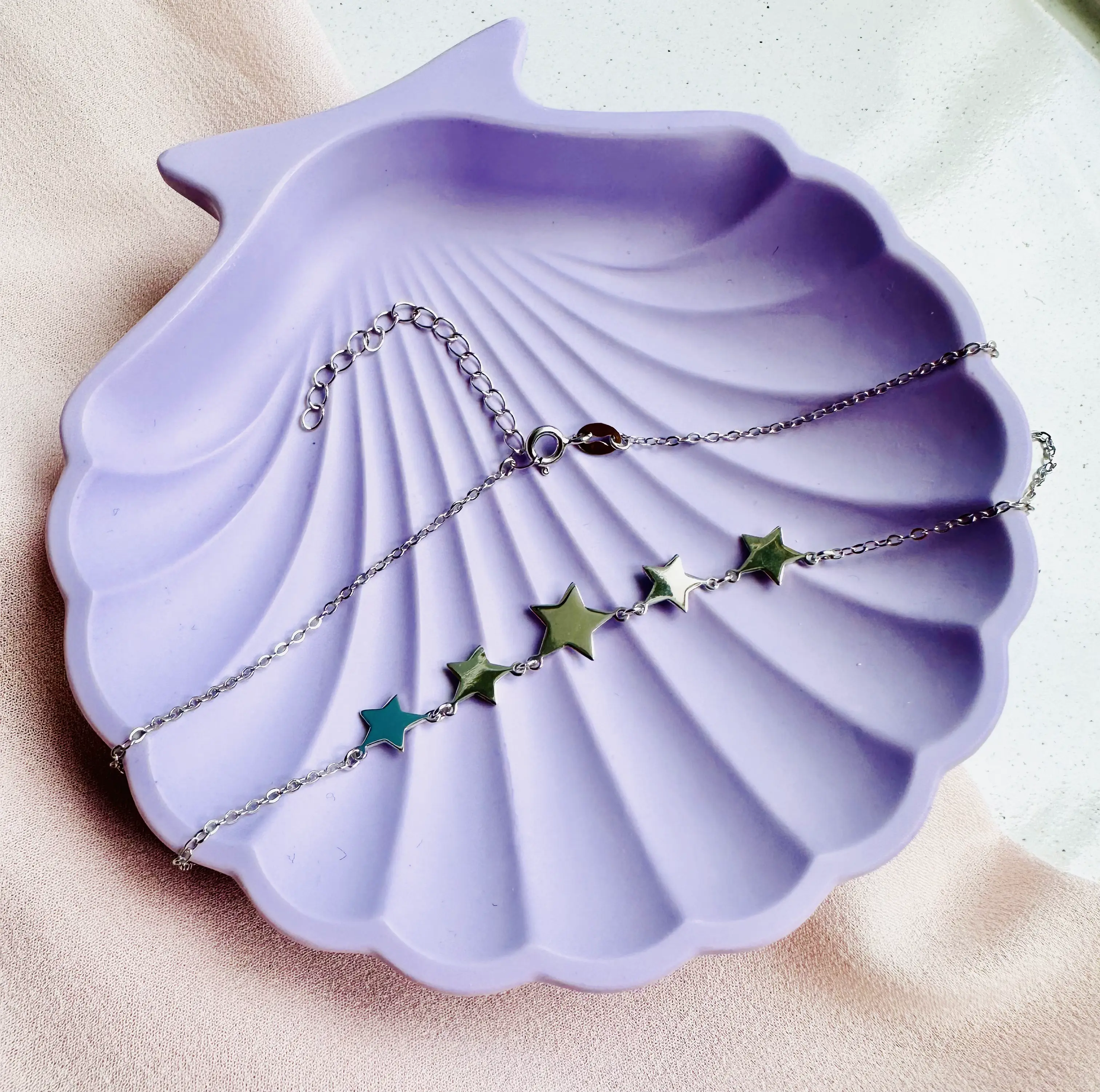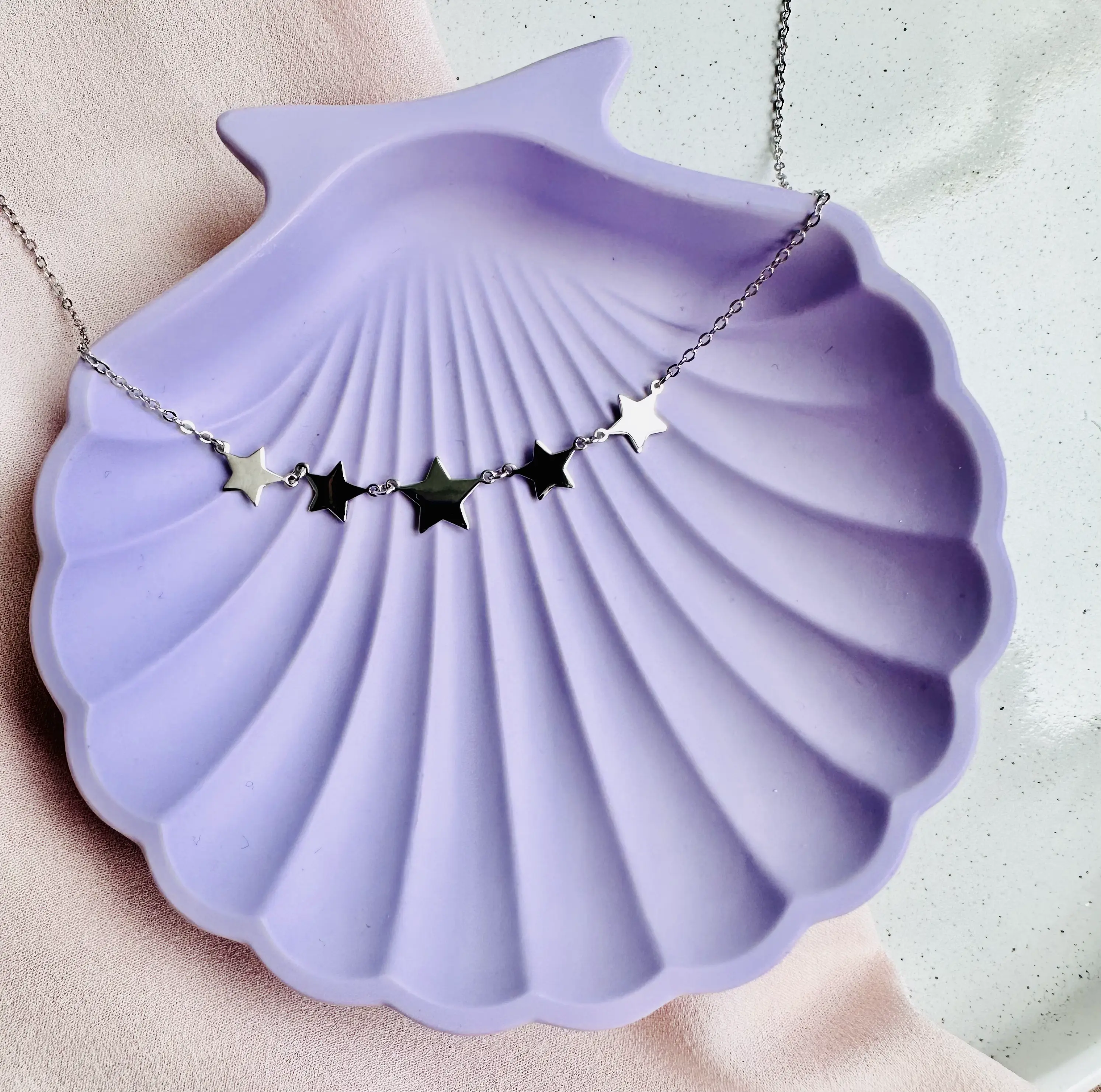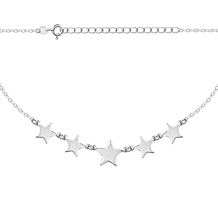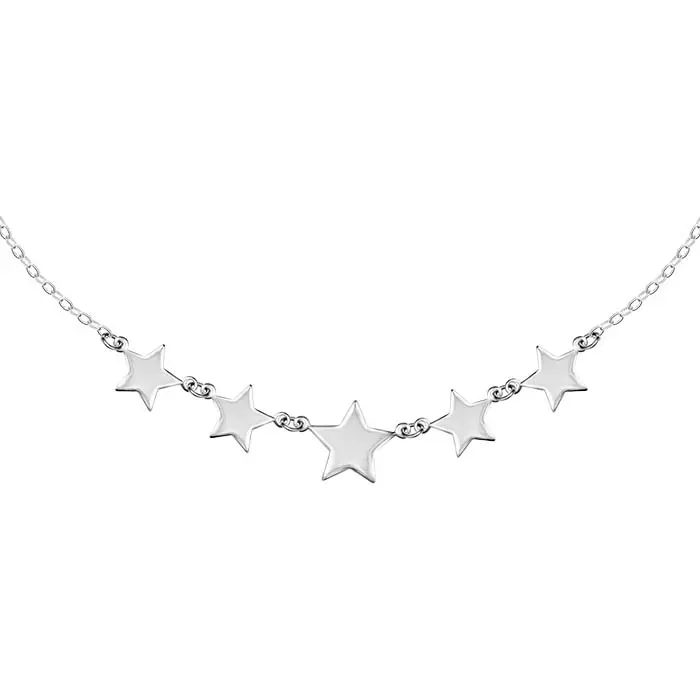 Niezwykły kobiecy naszyjnik z gwiazdkami wykonany z najlepszej próby srebra 925. Naszyjnik posiada możliwość regulacji. Pięknie prezentuje się z gładkim topem jak i elegancką sukienką. Jest to idealne uzupełnienie codziennej i wieczorowej stylizacji. Naszyjnik z gwiazdkami przyciągają uwagę swoim urokiem i delikatnością. Świetny pomysł na prezent dla bliskiej osoby, która ceni sobie oryginalność i wyjątkowość. Naszyjnik został zabezpieczony procesem rodowania co sprawia, że biżuteria pięknie się błyszczy i cechuje dużą odpornością na uszkodzenia i niekorzystne oddziaływanie środowiska. Biżuteria nie zawiera niklu, nie uczula i nie powoduje alergii.