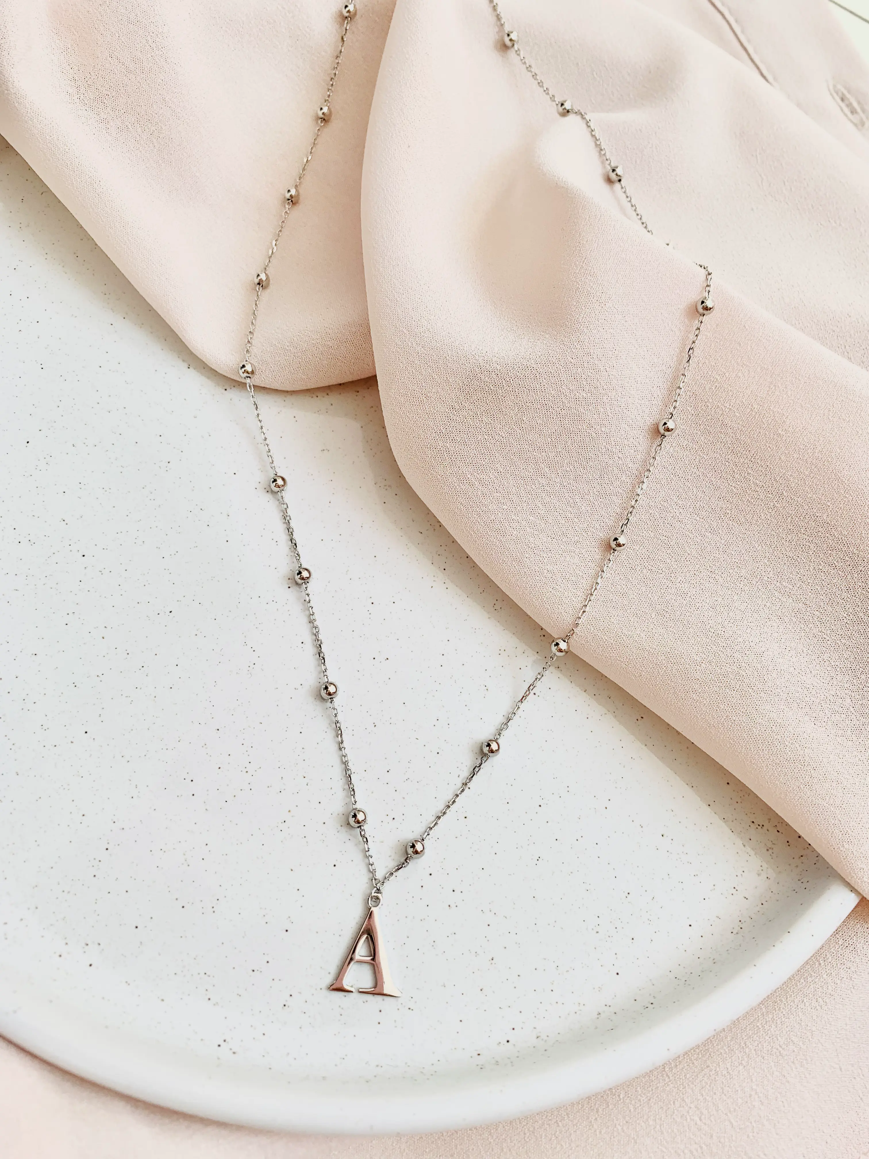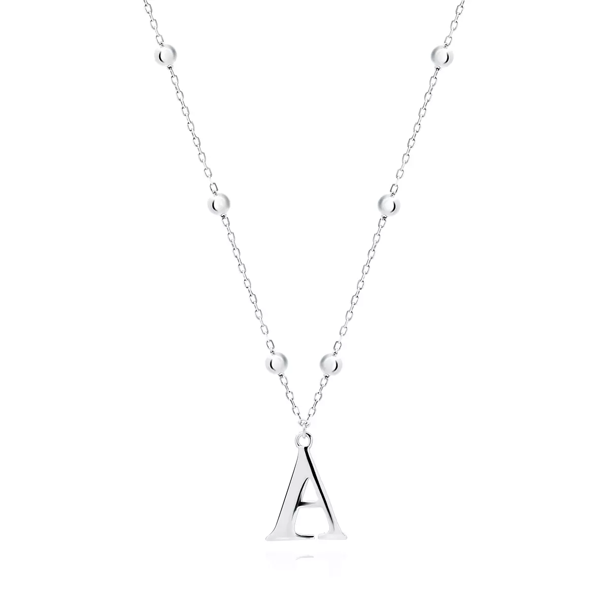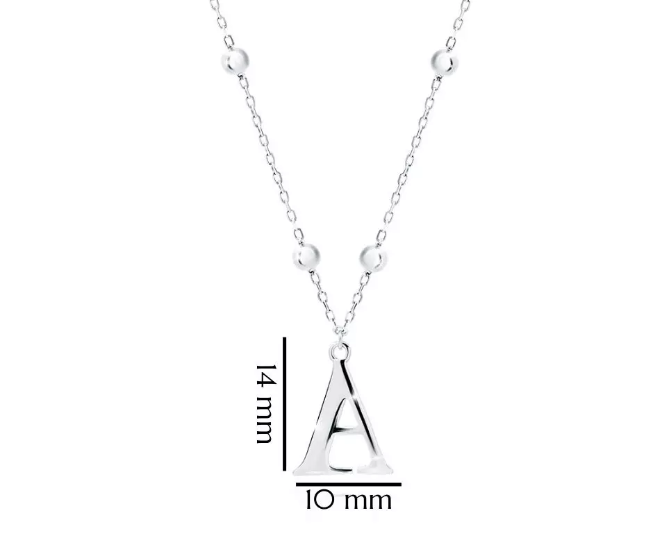 Piękny naszyjnik z kuleczkami wykonany z najlepszej próby srebra 925 rodowany z zawieszką literka A. Naszyjnik posiada możliwość regulacji. Pięknie prezentuje się z gładkim topem jak i elegancką sukienką. Jest to idealne uzupełnienie codziennej i wieczorowej stylizacji. Nowoczesny i awangardowy model naszyjnika, który idealne dopełni każdą stylizację. Świetny pomysł na prezent dla bliskiej osoby, która ceni sobie oryginalność i wyjątkowość. Stworzony z niezwykłą starannością i dbałością o szczegóły. Naszyjnik został zabezpieczony procesem rodowania co sprawia, że biżuteria pięknie się błyszczy i cechuje dużą odpornością na uszkodzenia i niekorzystne oddziaływanie środowiska. Biżuteria nie zawiera niklu, nie uczula i nie powoduje alergii.