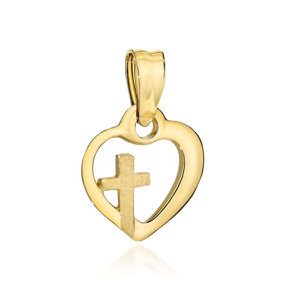 Kamień Bez kamienia Wzór Serce, krzyż Materiał Złoto Kolor złota Żółte Próba 585 Szerokość serca [mm] 12,20 Wysokość serca [mm] 13 Wysokość krzyżyka [mm] 5,80 Szerokość krzyżyka [mm] 5 Wysokość z zawieszką [mm] ok. 18 Precyzyjnie wykonana zawieszka próby 585. Pamiątka chrztu, pierwszej komunii, bierzmowania, ważnego jubileuszu czy rocznicy. Zajmujemy się sprzedażą biżuterii ze złota. Sprzedajemy towary pochodzące od krajowych i zagranicznych producentów. Wszystkie produkty pochodzą z legalnego źródła. Wystawiamy faktury VAT.