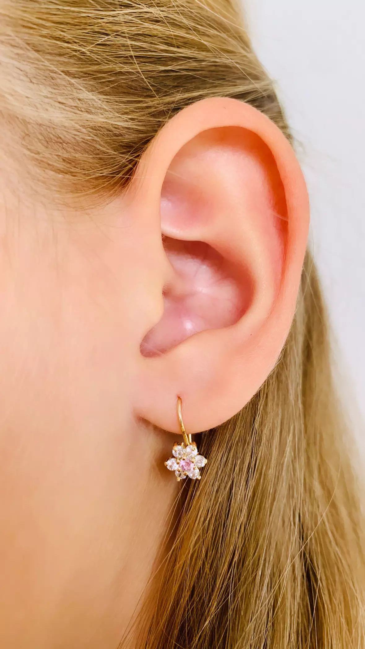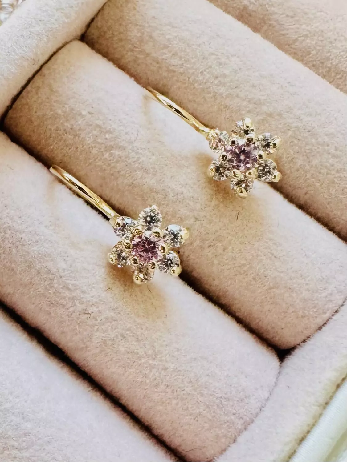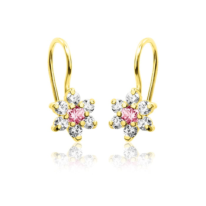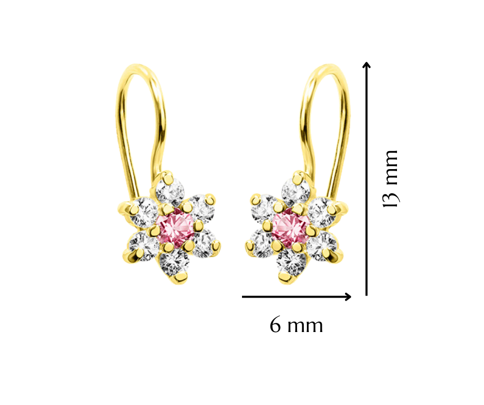 Delikatne kolczyki dla dziewczynki kwiatki, oprawione lśniącymi białymi cyrkoniami i jedną centralną w kolorze różowym, wykonane z żółtego złota próby 585. Kolczyki posiadają praktyczne i bezpieczne zapięcie typu bigiel, które gwarantuje wygodę noszenia. Piękne złote kolczyki wykonane z najwyższej jakości surowców to ponadczasowy model kolczyków, który jest odpowiedni zarówno dla małych, jak i dorastających dzieci. Kolczyki złote to biżuteria dla dzieci, doskonale sprawdzą się w roli pamiątki z okazji Pierwszej Komunii Świętej, Roczku, Chrztu Świętego lub innej wyjątkowej uroczystości. Jest to elegancki i uroczy model kolczyków, który pasuje do wielu stylizacji. Dodatkowo kolczyki posiadają, cechę urzędu probierczego co potwierdza, wysoką jakość naszych prezentów. Efektowne złote kolczyki to piękna pamiątka na lata.