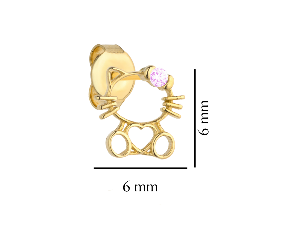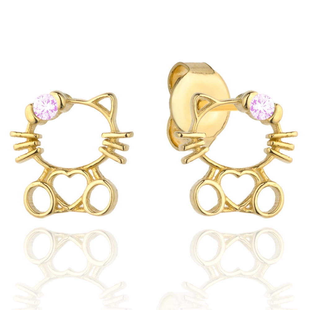 Urocze złote kolczyki kotki z serduszkiem dla dziewczynki, zostały wykonane ze złota próby 585, oprawione małą różową cyrkonią. Kolczyki posiadają bezpieczne zapięcie typu sztyft, które gwarantuje wygodę noszenia. Złote kolczyki kotki to doskonała propozycja na prezent dla małych miłośniczek tych cudownych zwierząt. Kolczyki w kształcie kotów to piękna i delikatna biżuteria, która jest często wybierana ze względu na swoją lekkość i subtelność. Śliczna biżuteria dla dzieci, doskonale sprawdzi się w roli pamiątki z okazji Pierwszej Komunii Świętej, Chrztu Świętego lub innej wyjątkowej uroczystości. Jest to elegancki i uroczy model kolczyków, który pasuje do wielu stylizacji. Małe kobietki zawsze będą szczęśliwe, otrzymując w prezencie cudowną, budzącą uśmiech, delikatną złotą biżuterię.