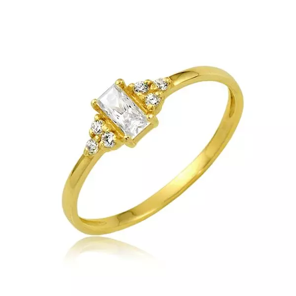 Pierścionek wykonany został z wysokiej jakości złota próby 585, co gwarantuje jego trwałość i piękny połysk na długie lata. Na szczególną uwagę zasługuje prostokątna centralna cyrkonia, która przyciąga wzrok eleganckim blaskiem, otoczona drobniejszymi kamieniami w precyzyjnej oprawie jubilerskiej. Całość tworzy ponadczasowy pierścionek, który pięknie prezentuje się zarówno na drobnej dłoni dziecka, jak i kobiety.